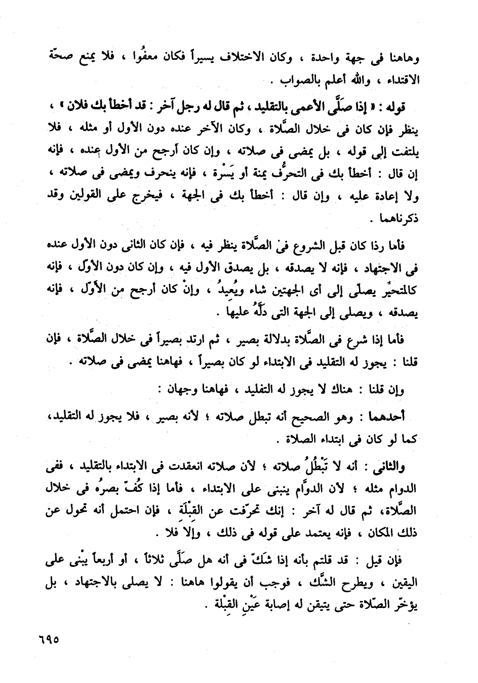 والثاني: أنه لا تبطل صلاته؛ لأن صلاته انعقدت في الابتداء بالتقليد، ففي الدوام مثله؛ لأن الدوام ينبني على الابتداء، فأما إذا كف بصره في خلال الصلاة، ثم قال له آخر: فإن احتمل أنه تحول عن ذلك المكان، فإنه يعتمد على قوله في ذلك، وإلا فلا.