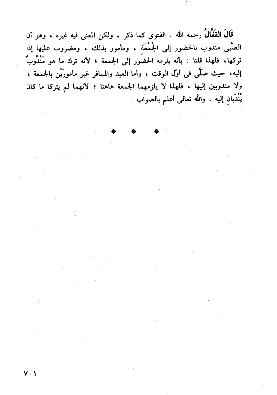 قال القفال: رحمه الله الفتوى كما ذكر، ولكن المعنى فيه غيره، وهو أن الصبي مندوب بالحضور إلى الجمعة، ومأمور بذلك، ومضروب عليها إذا تركها فلهذا قلنا: بأنه يلزمه الحضور إلى الجمعة، لأنه ترك ما هو مندوب إليه، حيث صلى في أول الوقت، وأما العبد والمسافر غير مأمورين بالجمعة ولا مندوبين إليها، فلهذا لا يلزمها الجمعة ها هنا، لأنهما لم يتركا ما كان يندبان إليه، والله تعالى أعلم بالصواب.