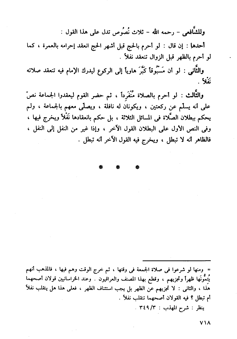 والثالث: لو أحرم بالصلاة منفردًا، ثم حضر القوم ليعقدوا الجماعة نص على أنه يسلم عن ركعتين، ويكونان له نافلة، ويصلي معهم بالجماعة، ولم يحكم ببطلان الصلاة في المسائل الثلاثة، بل حكم بانعقادها نفلاً ويخرج فيها، وفي النص الأول على البطلان القول الآخر، وإذا غير من النفل إلى النفل، فالظاهر أنه لا تبطل، ويخرج فيه القول الآخر أنه تبطل.