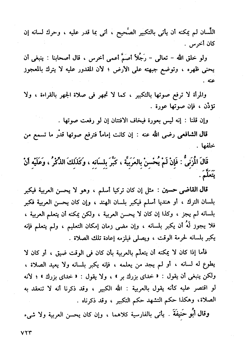 قال المزني: فإن لم يحسن بالعربية، كبر بلسانه، وكذلك الذكر، وعليه أن يتعلم.