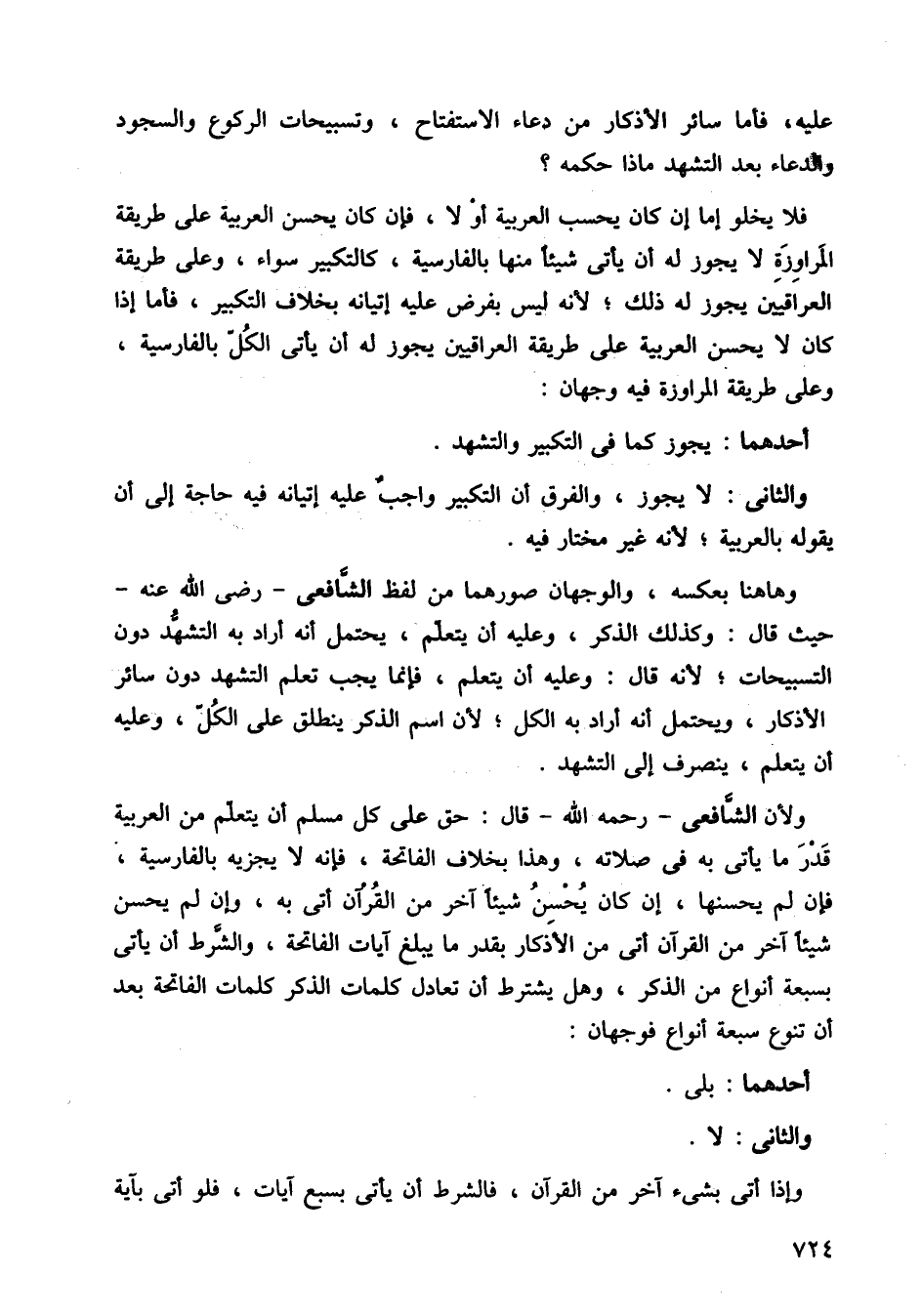 ولأن الشافعي، رحمه الله قال: حق على كل مسلم أن يتعلم من العربية قدر ما يأتي به في صلاته، وهذا بخلاف الفاتحة، فإنه لا يجزيه بالفارسية، فإن لم يحسنها، إن كان يحسن شيئًا آخر من القرآن أتى به، وإن لم يحسن شيئًا آخر من القرآن من الأذكار بقدر ما يبلغ آيات الفاتحة، والشرط أن يأتي بسبعة أنواع من الذكر، وهل يشترط أن تعادل كلمات الذكر كلمات الفاتحة بعد أن تنوع سبعة أنواع فوجهان: