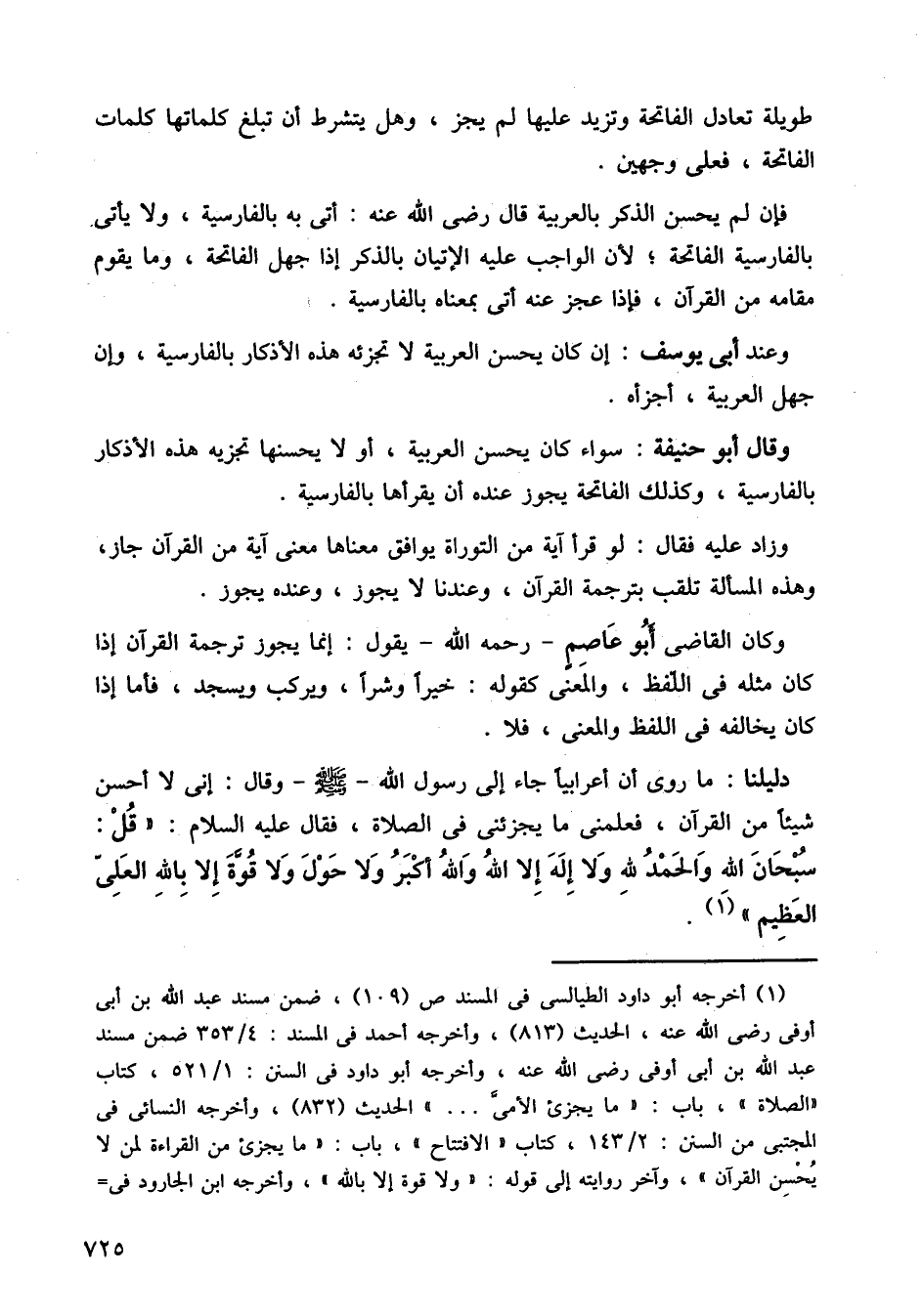 وقال أبو حنيفة: سواء كان يحسن العربية، او لا يحسنها تجزيه هذه الأذكار بالفارسية، وكذلك الفاتحة يجوز عنده أن يقرأها بالفارسية.