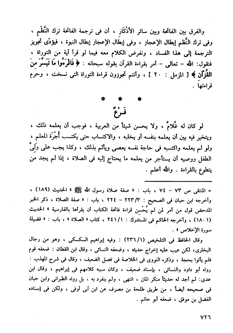 والفرق بين الفاتحة وبين سائر الأذكار، أن في ترجمة الفاتحة ترك النظم، وفي ترك النظم إبطال الإعجاز، وفي إبطال الإعجاز إبطال النبوة، فيؤدي تجويز الترجمة إلى هذا الفساد، ونفرض الكلام معه فيما لو قرأ آية من التوراة، فنقول: الله تعالى أمر بقراءة القرآن بقوله سبحانه، فاقرءوا ما تيسر من القرآن، وأنتم تجوزون قراءة التوراة التي نسخت، وحرم قراءتها.