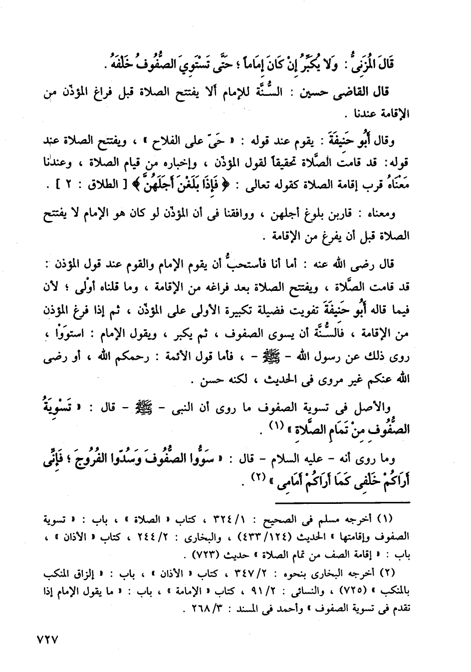 قال المزني: ولا يكبر إن كان إمامًا، حتى تستوي الصفوف خلفه.