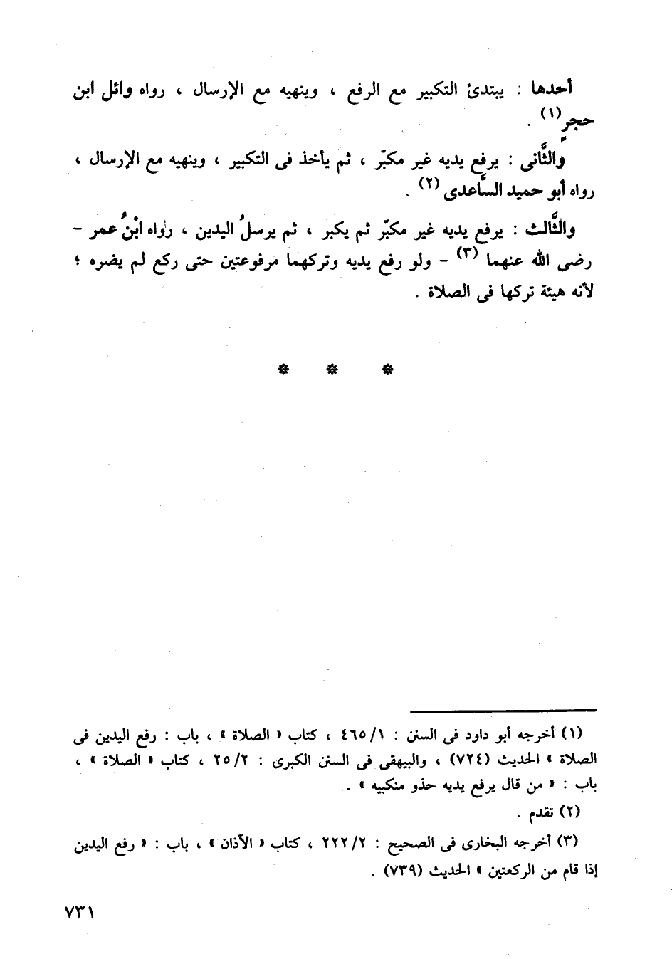 والثاني: يرفع يديه غير مكبر، ثم يأخذ في التكبير، وينهيه مع الإرسال، رواه أبو حميد الساعدي.