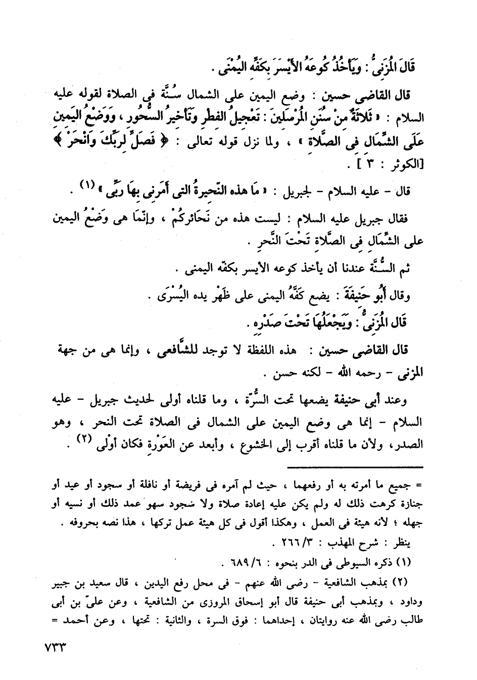 قال القاضي حسين: وضع اليمين على الشمال سنة في الصلاة لقوله عليه السلام: «ثلاثة من سنن المرسلين تعجيل الفطر، وتأخير السحور، ووضع اليمين على الشمال في الصلاة»، ولما نزل قوله تعالى: (فصل لربك وانحر). قال عليه السلام لجبريل: «ما هذه النحيرة التي أمرني بها ربي».