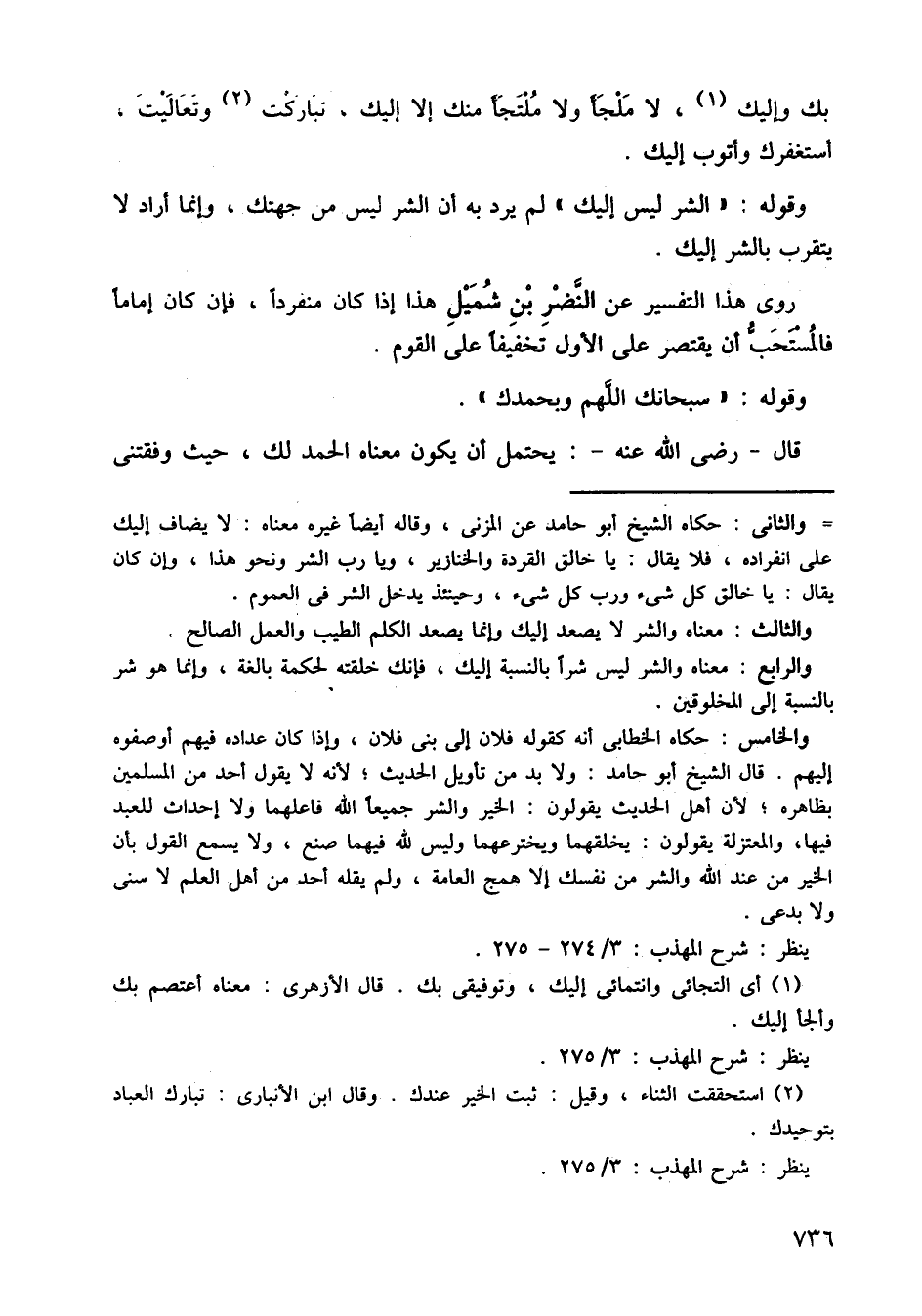 وقوله: الشر ليس إليك، لم يرد به أن الشر ليس من جهتك، وإنما أراد لا يتقرب بالشر إليك، روى هذا التفسير عن النضر بن شميل هذا إذا كان منفردًا، فإن كان إمامًا، فالمستحب أن يقتصر على الأول تخفيفًا على القوم.