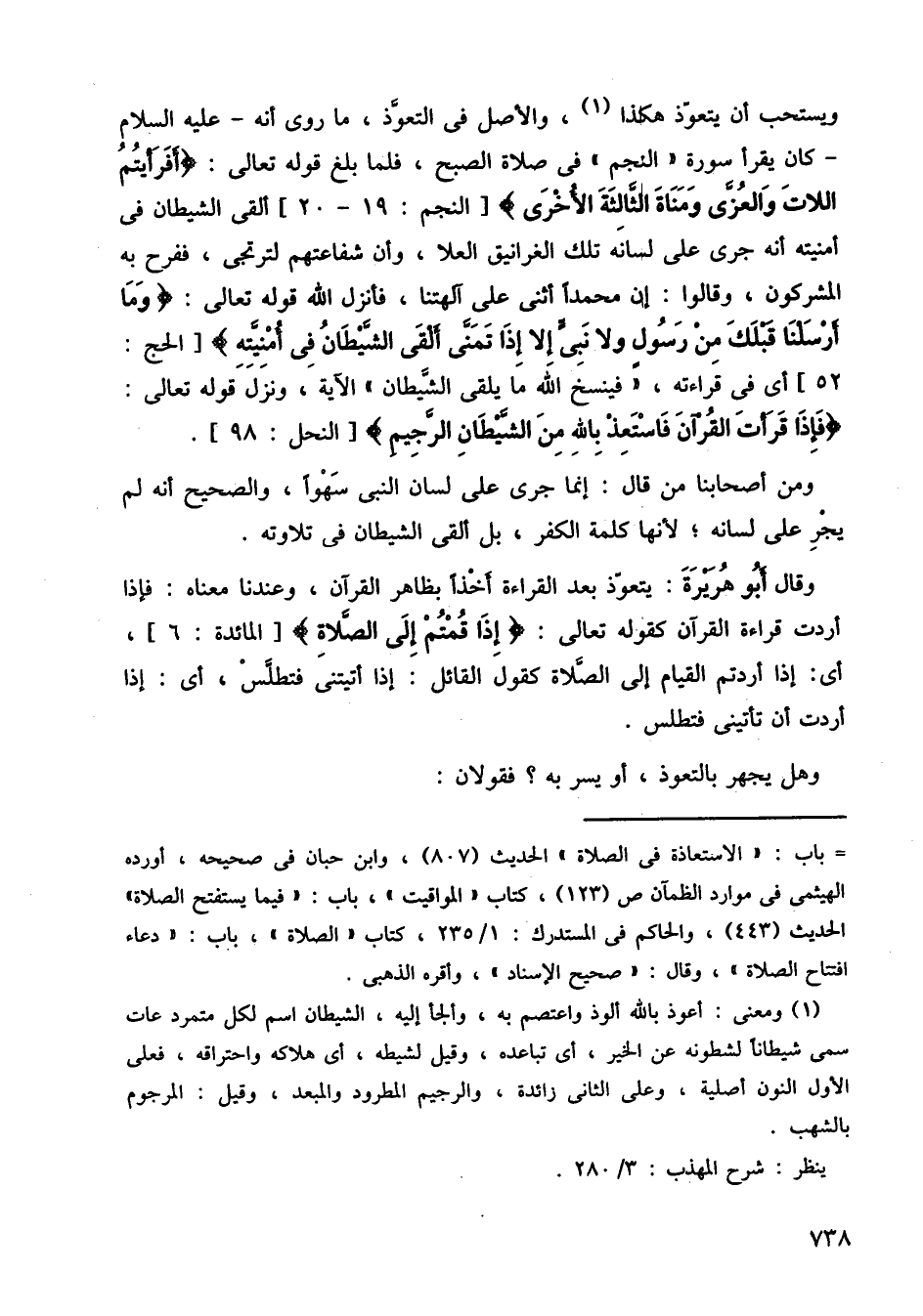 ويستحب أن يتعوذ هكذا. والأصل في التعوذ، ما روى أنه عليه السلام كان يقرأ سورة النجم، في صلاة الصبح، فلما بلغ قوله تعالى: أفرأيتم اللات والعزى ومناة الثالثة الأخرى، ألقى الشيطان في أمنيته أنه جرى على لسانه تلك الغرانيق العلا، وأن شفاعتهم لترتجى، ففرح به المشركون، وقالوا إن محمدا أثنى على آلهتنا، فأنزل الله قوله تعالى وما أرسلنا قبلك من رسول ولا نبي إلا إذا تمنى ألقى الشيطان في أمنيته، أي في قراءته، فينسخ الله ما يلقي الشيطان، الاية، ونزل قوله تعالى فإذا قرات القرآن فاستعذ بالله من الشيطان الرجيم،