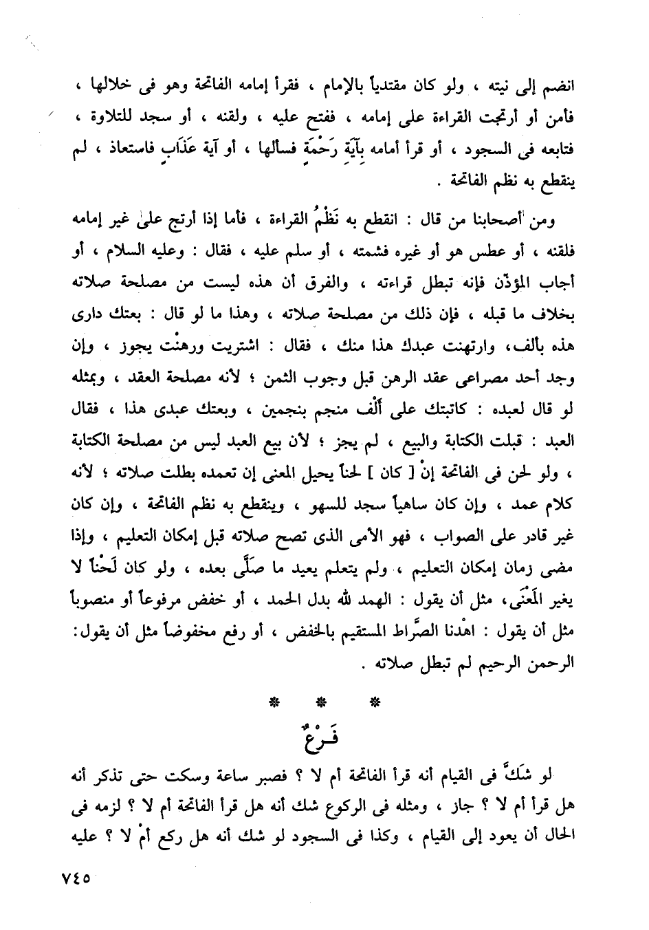 ومن أصحابا من قال: انقطع به نظم القراءة، فأما إذا أرتج على غير إمامه فلقنه، أو عطس هو أو غيره فشمته، أو سلم عليه، فقال: وعليه السلام، أو أجاب المؤذن فإنه تبطل قراءته، والفرق أن هذه ليست من مصلحة صلاته بخلاف ما قبله، فإن ذلك من مصلحة صلاته، وهذا ما لو قال: بعتك داري هذه بألف، وارتهنت عبدك هذا منك، فقال: اشتريت ورهنت يجوز، وإن وجد أحد مصراعي عقد الرهن قبل وجوب الثمن؛ لأنه مصلحة العقد، وبمثله لو قال لعبده: كاتبتك على ألف منجم بنجمين، وبعتك عبدي هذا، فقال العبد: قبلت الكتابة والبيع، لم يجز، لأن بيع العبد ليس من مصلحة الكتابة، ولو لحن في الفاتحة إن [كان] لحنًا يحيل المعنى إن تعمده بطلت صلاته، لأنه كلام عمد، وإن كا ساهيًا سجد للسهو، وينقطع به نظم الفاتحة، وإن كان غير قادر على الصواب، فهو الأمي الذي تصح صلاته قبل إمكان التعليم، وإذا مضى زمان إمكان التعليم، ولم يتعلم يعيد ما صلى بعده، ولو كان لحنًا لا يغير المعنى، مثل أن يقول: الهمد لله بدل الحمد، أو خفض مرفوعًا أو منصوبًا مثل أن يقول: اهدنا الصراط المستقيم بالخفض، أو رفع مخفوضًا مثل أن يقول: الرحمن الرحيم لم تبطل صلاته.