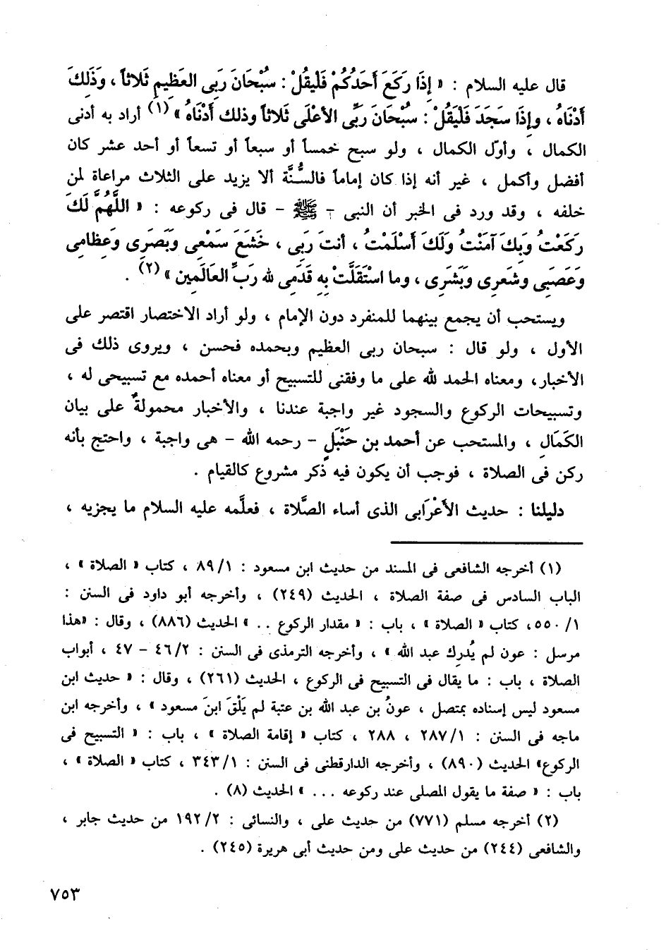 قال عليه السلام: (إذا ركع أحدكم فليقل: سبحان ربي العظيم ثلاثًا، وذلك أدناه، وإذا سجد فليقل، سبحان ربي الأعلى ثلاثًا وذلك أدناه)، أراد به أدنى الكمال، وأول الكمال، ولو سبح خمسًا أو سبعًا أو تسعًا أو أحد عشر كان أفضل وأكمل، غير انه إذا كان إماما فالسنة ألا يزيد على الثلاث مراعاة لمن خلفه، وقد ورد في الخبر ان النبي صلى الله عليه وسلم قال في ركوعه اللهم لك ركعت وبك آمنت ولك أسلمت، أنت ربي، خشع سمعي وبصري وعظامي وعصبي وشعري وبشري، وما استقلت به قدمي لله رب العالمين.