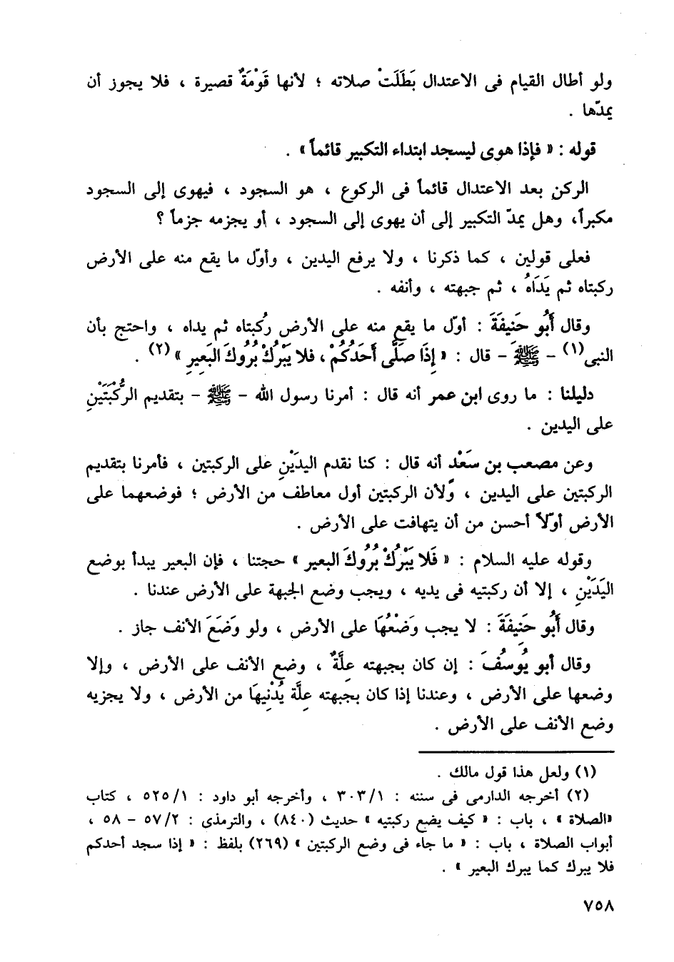 وقوله عليه السلام: فلا يبرك بروك البعير، حجتنا، فإن البعير يبدأ بوضع اليدين، إلا أن ركبتيه في يديه، ويجب وضع الجبهة على الأرض عندنا.