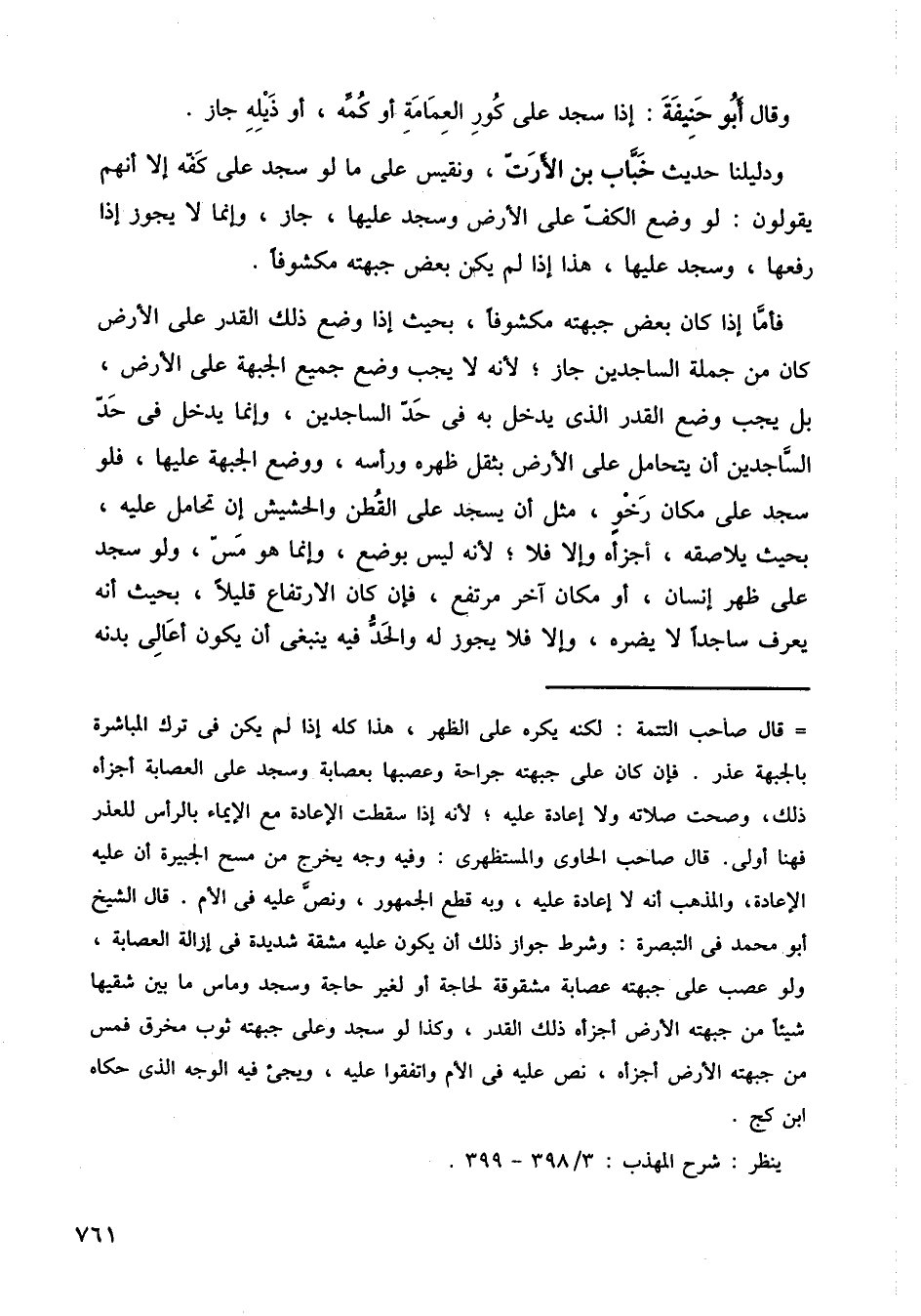 ودليلنا حديث خباب بن الأرت، ونقيس على ما لو سجد على كفه إلا أنهم يقولون: لو وضع الكف على الأرض وسجد عليها، جاز وإنما لا يجوز إذا رفعها وسجد عليها، هذا إذا لم يكن بعض جبهته مكشوفًا.
