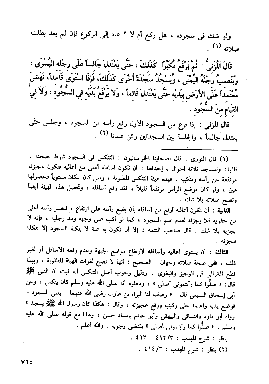 قال المزني: ثم يرفع مكبرًا كذلك، حتى يعتدل جالسًا على رجله اليسرى، وينصب رجله اليمني، ويسجد سجدة أخرى كذلك، فإذا استوى قاعدًا، نهض معتمدًا على الأرض بيديه حتى يعتدل قائمًا، ولا يرفع يديه في السجود، ولا في القيام من السجود.
