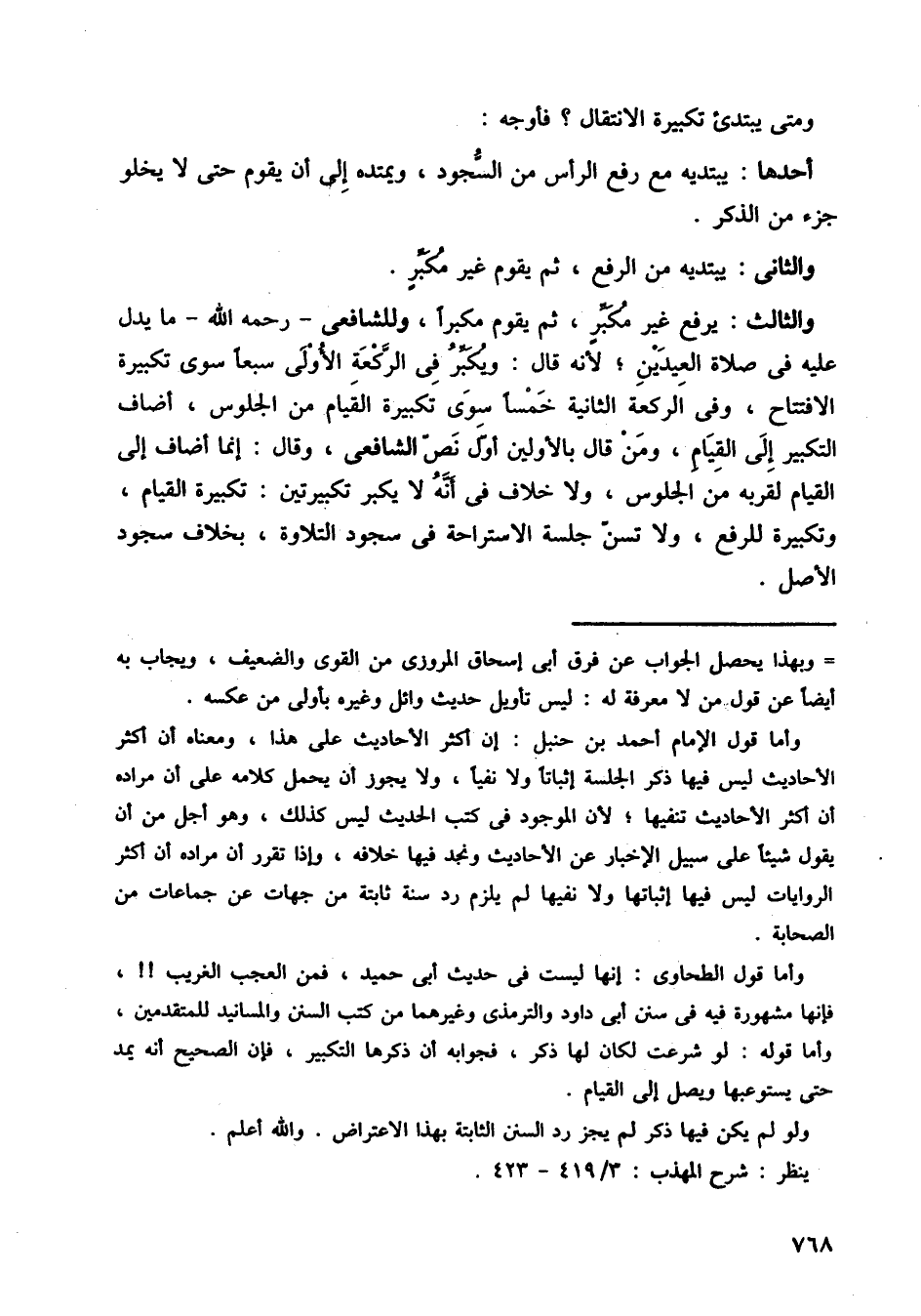والثالث: يرفع غير مكبر، ثم يقوم مكبرًا، وللشافعي رحمه الله، ما يدل عليه في صلاة العيدين، لأنه قال: ويكبر في الركعة الأولى سبعًا سوى تكبيرة الافتتاح، وفي الركعة الثانية خمسًا سوى تكبيرة القيام من الجلوس، أضاف التكبير إلى القيام، ومن قال بالأولين أول نص الشافعي، وقال: إنما أضاف إلى القيام لقربه من الجلوس،، ولا خلاف في انه لا يكبر تكبيرتين: تكبيرة القيام، وتكبيرة للرفع، ولا تسن جلسة الاستراحة في سجود التلاوة، بخلاف سجود الأصل.