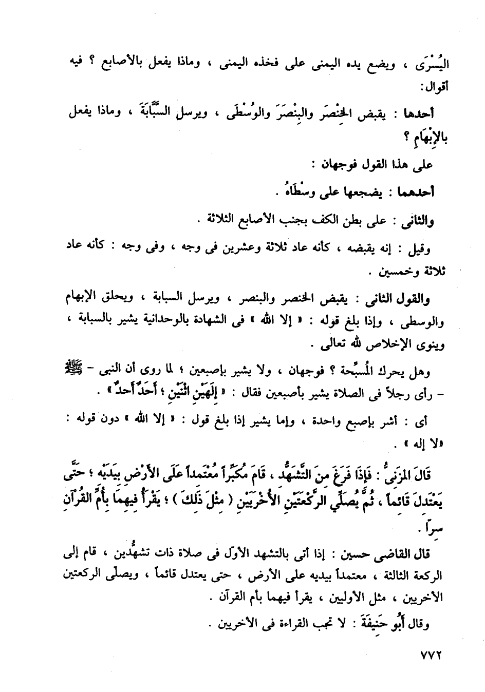 اليسرى، ويضع يده اليمني على فخذه اليمني، وماذا يفعل بالأصابع؟ فيه أقوال: