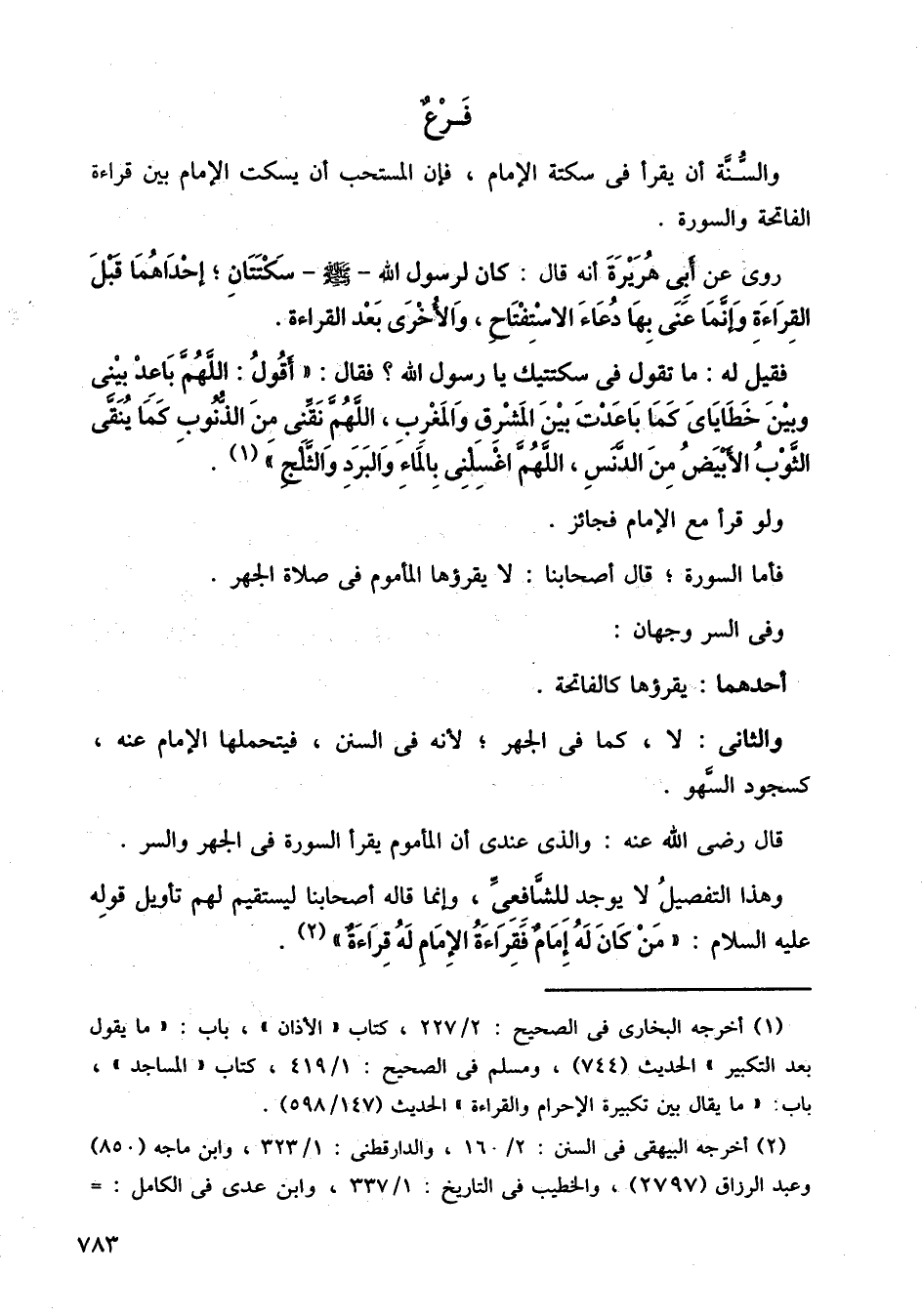 روى عن أبي هريرة أنه قال: كان لرسول الله صلى الله عليه وسلم سكتتان؛ إحداهما قبل القراءة وإنما عنى بها دعاء الاستفتاح، والأخرى بعد القراءة.