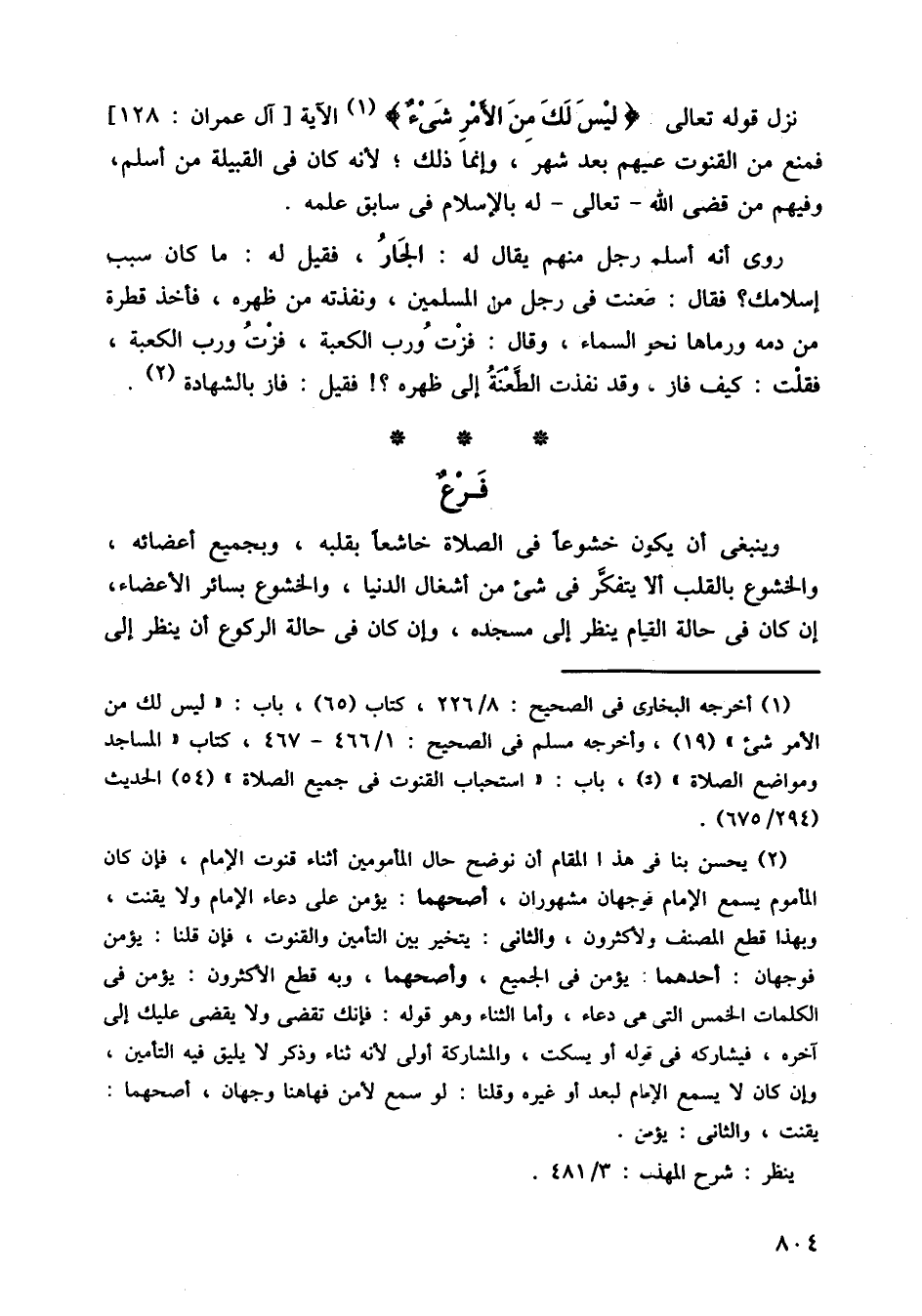 نزل قوله تعالى (ليس لك من الأمر شيءٌ) فمنع من القنوت عليهم بعد شهر، وإنما ذلك لأنه كان في القبيلة من أسلم وفيهم من قضى الله تعالى له بالإسلام في سابق علمه.