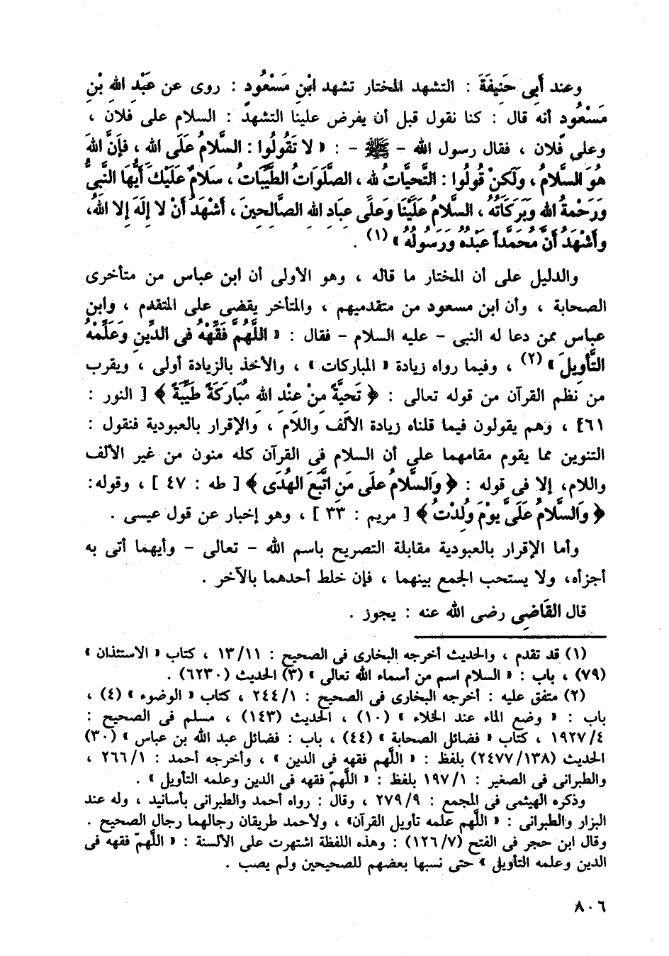 والدليل على أن المختار ما قاله، وهو الأولى أن ابن عباس من متأخري الصحابة، وأن ابن مسعود من متقدميهم، والمتأخر يقضي على المتقدم، وابن عباس ممن دعا له النبي صلى الله عليه وسلم فقال: اللهم فقهه في الدين وعلمه التأويل، وفيما رواه زيادة المباركات، والأخذ بالزيادة أولى، ويقرب من نظم القرآن من قوله تعالى: (تحية من عند الله مباركة طيبة)، وهم يقولون فيما قلناه زيادة الألف واللام، والإقرار بالعبودية فنقول: التنوين مما يقوم مقامهما على أن السلام في القرآن كله منون من غير الألف، واللام إلا في قوله: والسلام على من اتبع الهدى، وقوله: والسلام على يوم ولدت، وهو اخبار عن قول عيسى.