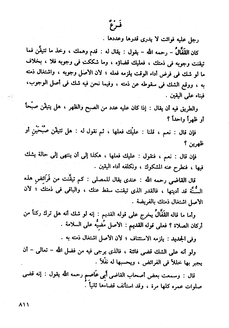كان القفال رحمه الله يقول: يقال له: قدم وهمك، وخذ ما تتيقن فما تيقنت وجوبه في ذمتك، فعليك قضاؤه، وما شككت في وجوبه فلا، بخلاف ما لو شك في فرض أداء لوقت يلزمه فعله، لأن الأصل وجوبه، واشتغال ذمته به، ووقع الشك في سقوطه عن ذمته، وفيما نحن فيه شك في أصل الوجوب فبناء على اليقين.