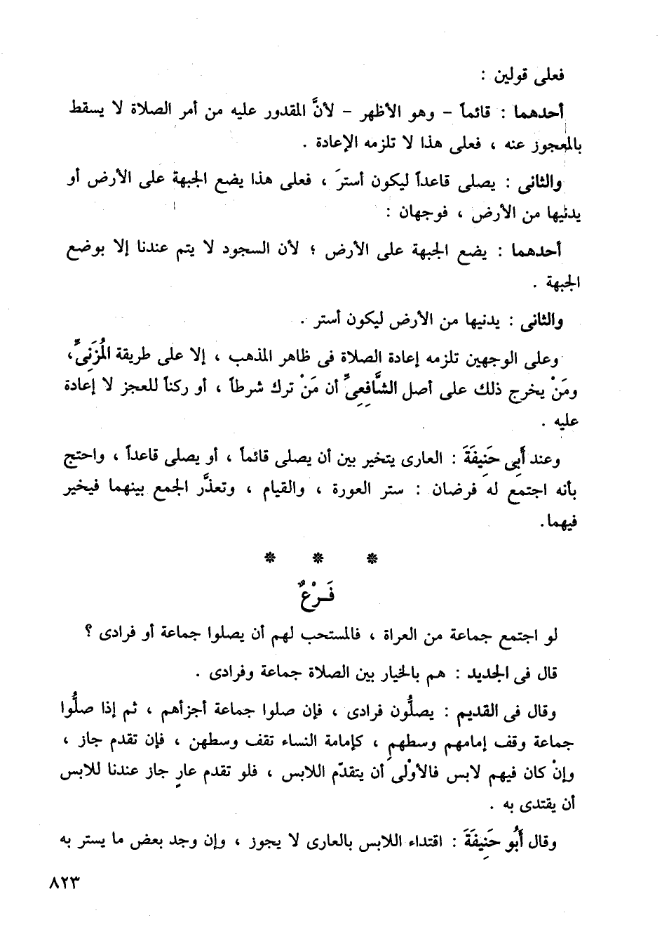 وعند أبي حنيفة، العاري يتخير بين أن يصلي قائمًا، او يصلي قاعدًا، واحتج بأنه اجتمع له فرضان: ستر العورة، والقيام، وتعذر الجمع بينهما فيخير فيهما.