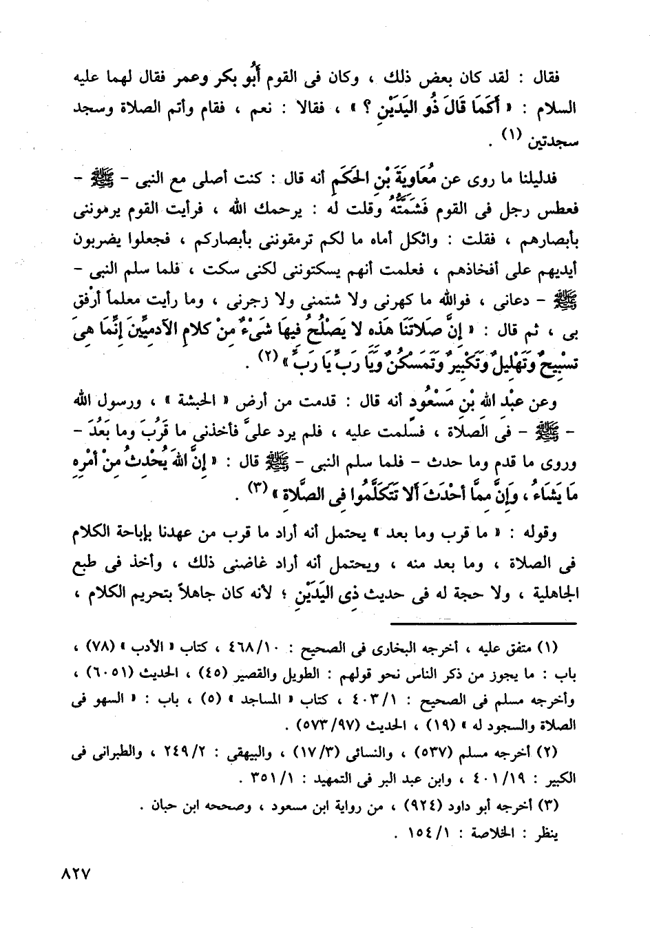 وعن عبد الله بن مسعود أنه قال: قدمت من أرض الحبشة، ورسول الله صلى الله عليه وسلم في الصلاة، فسلمت عليه، فلم يرد على فأخذني ما قرب وما بعد، وروى ما قدم وما حدث، فلما سلم النبي صلى الله عليه وسلم قال: إن الله يحدث من أمره ما يشاء، وإن مما أحدث ألا تتكلموا في الصلاة.