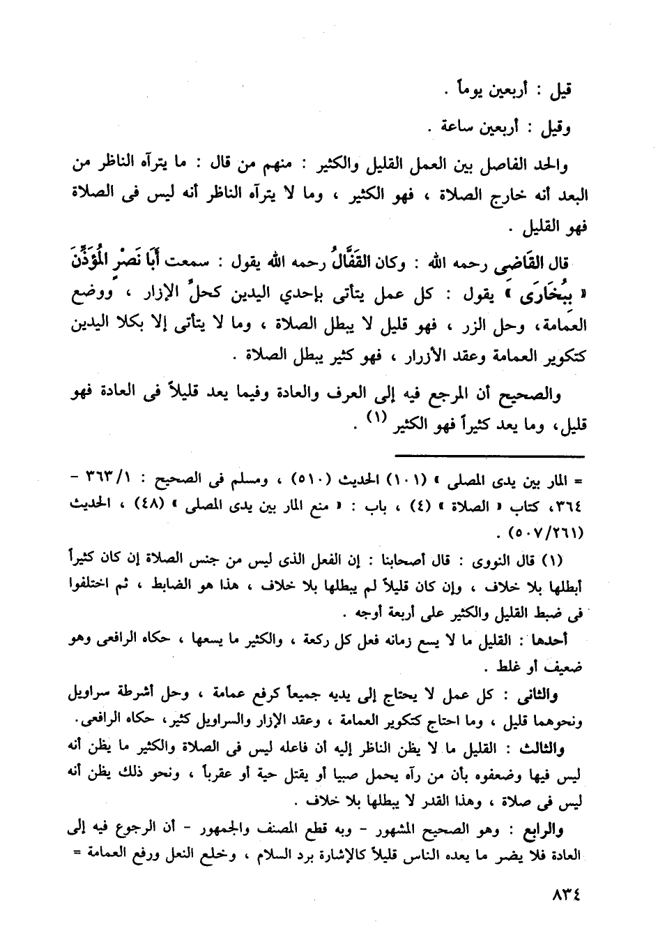 قال القاضي رحمه الله: وكان القفال رحمه الله يقول: سمعت أبا نصر المؤذن ببخارى، يقول: كل عمل يتأتي بإحدى اليدين كحل الإزار، ووضع العمامة، وحل الزر، فهو قليل لا يبطل الصلاة، وما لا يتأتي إلا بكلا اليدين كتكوير العمامة، وعقد الأزرار، فهو كثير يبطل الصلاة.