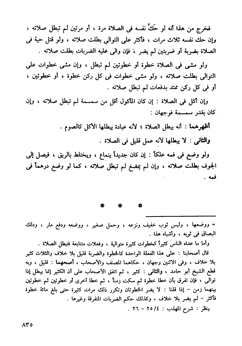 فخرج من هذا انه لو حك نفسه في الصلاة مرة، أو مرتين لم تبطل صلاته، وإن حك نفسه ثلاث مرات، فأكثر على التوالي بطلت صلاته، ولو قتل حية في الصلاة بضربة أو ضربتين لم يضر، فإن والي عليه الضربات بطلت صلاته.