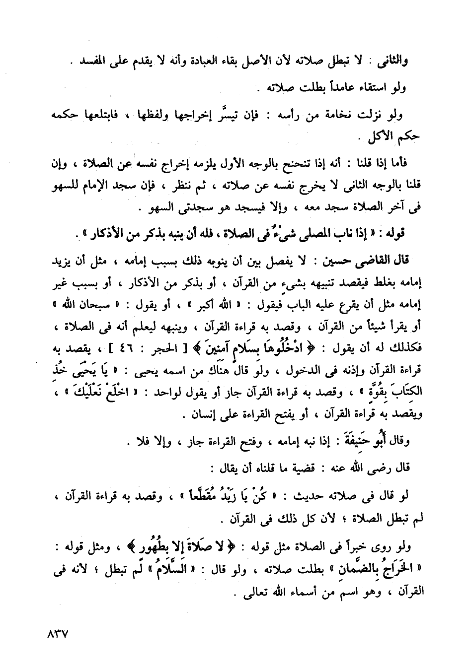 قال القاضي حسين: لا يفصل بين أن ينوبه ذلك بسبب إمامه، مثل أن يزيد إمامه بغلط فيقصد تنبيهه بشيء من القرآن، أو بذكر من الأذكار، أو بسبب غير إمامه مثل أن يقرع عليه الباب فيقول: الله أكبر، أو يقول: سبحان الله، أو يقرأ شيئًا من القرآن، وقصد به قراءة القرآن، وينبهه ليعلم أنه في الصلاة، فكذلك له أن يقول: ادخلوها بسلام آمنين، يقصد به قراءة القرآن وإذنه في الدخول، ولو قال هناك من اسمه يحيى: يا يحيى خذ الكتاب بقوة، وقصد به قراءة القرآن جاز أو يقصد لواحد: اخلع نعليك، ويقصد به قراءة القرآن، أو يفتح القراءة على إنسان.