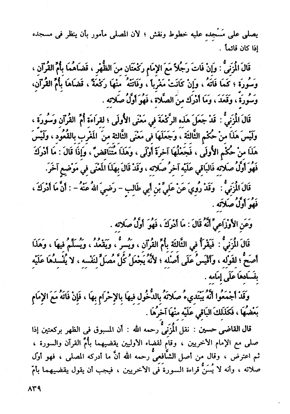 قال المزني: قد جعل هذه الركعة في معنى الأولى، لقراءة أم القرآن وسورة وليس هذا من حكم الثالثة، وجعلها في معنى الثالثة من المغرب بالقعود، وليس هذا من حكم الأولى، فجعلها آخرة اولى، وهذا متناقض، وإذا قال: ما أدرك فهو أول صلاته فالباقي عليه آخر صلاته وقد قال بهذا المعنى في موضع آخر.