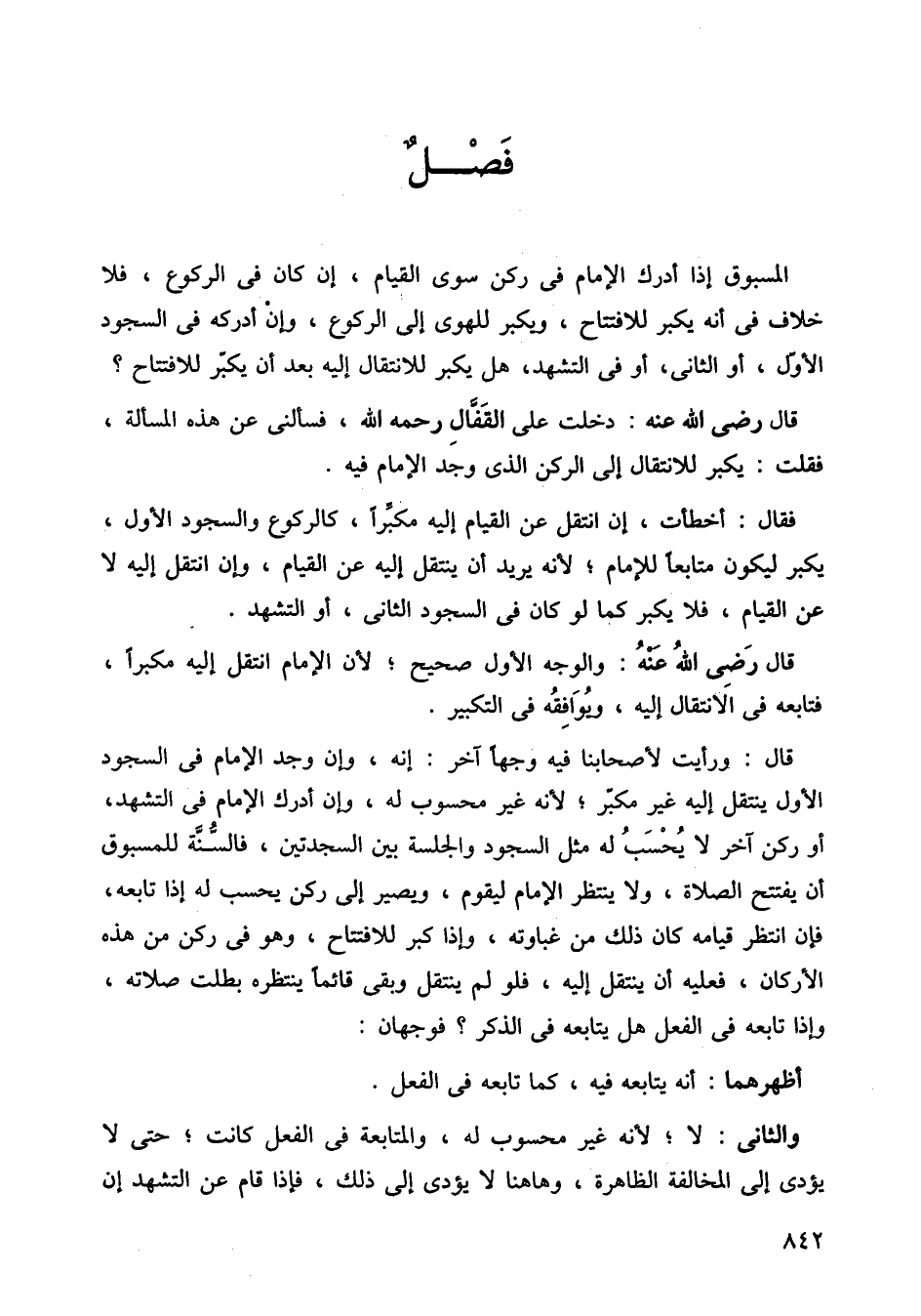 قال: ورأيت لأصحابنا فيه وجهًا آخر: إنه، وإن وجد الإمام في السجود الأول ينتقل إليه غير مكبر، لأنه غير محسوب له، وإن أدرك الإمام في التشهد، او ركن آخر لا يحسب له مثل السجود والجلسة بين السجدتين، فالسنة للمسبوق أن يفتتح الصلاة، ولا ينتظر الإمام ليقوم، ويصير إلى ركن يحسب له إذا تابعه، فإن انتظر قيامه، كان ذلك من غباوته، وإذا كبر للافتتاح، وهو في ركن من هذه الأركان، فعليه أن ينتقل إليه، فلو لم ينتقل وبقي قائمًا ينتظره بطلت صلاته، وإذا تابعه في الفعل هل يتابعه في الذكر؟ فوجهان: