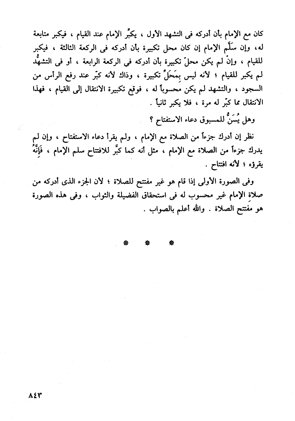 وفي الصورة الأولى إذا قام هو غير مفتتاح للصلاة، لأن الجزء الذي أدركه من صلاة الإمام غير محسوب له في استحقاق الفضيلة والثواب، وفي هذه الصورة هو مفتتح الصلاة. والله أعلم بالصواب.