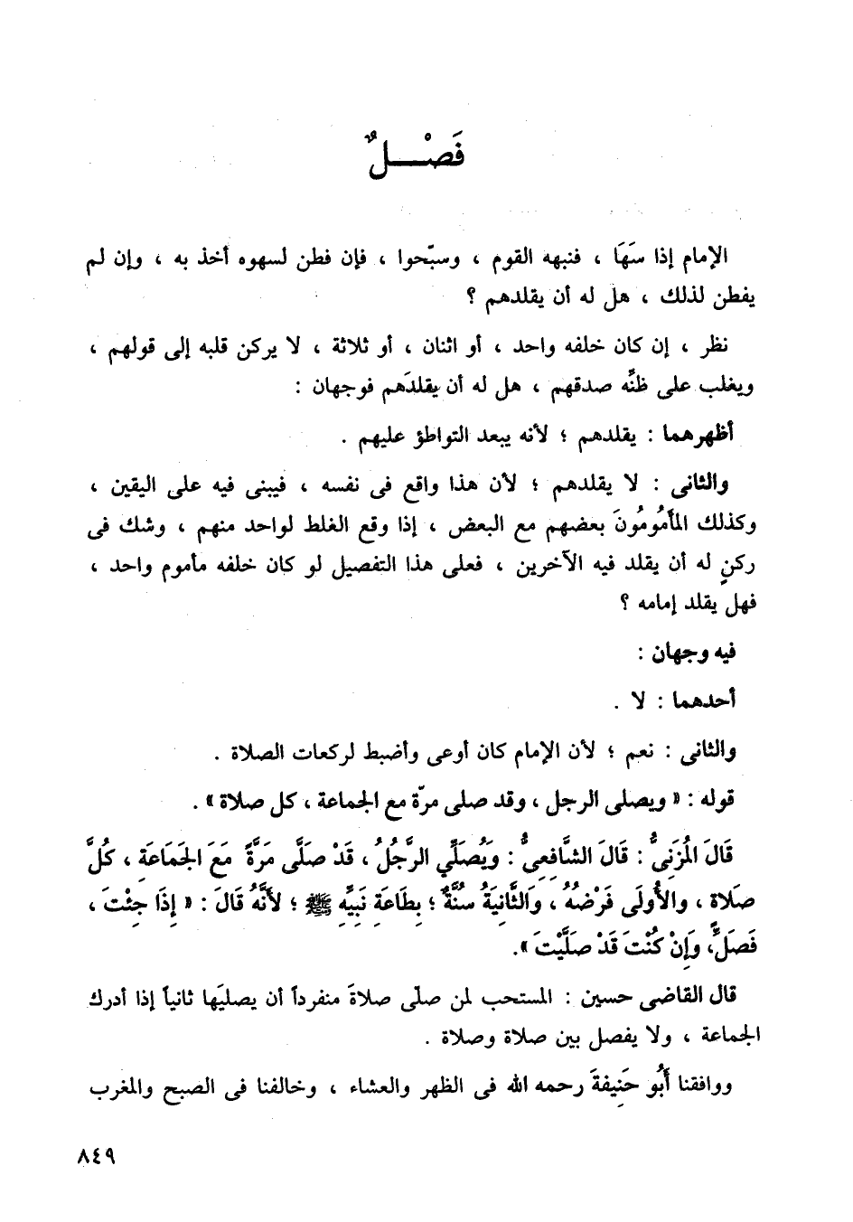 والثاني: لا يقلدهم، لأن هذا واقع في نفسه، فيبني فيه على اليقين، وكذلك المأموم، بعضهم مع البعض، إذا وقع الغلط لواحد منهم، وشك في ركن له أن يقلد فيه الآخرين، فعلى هذا التفصيل لو كان خلفه مأموم واحد، فهل يقلد إمامه؟