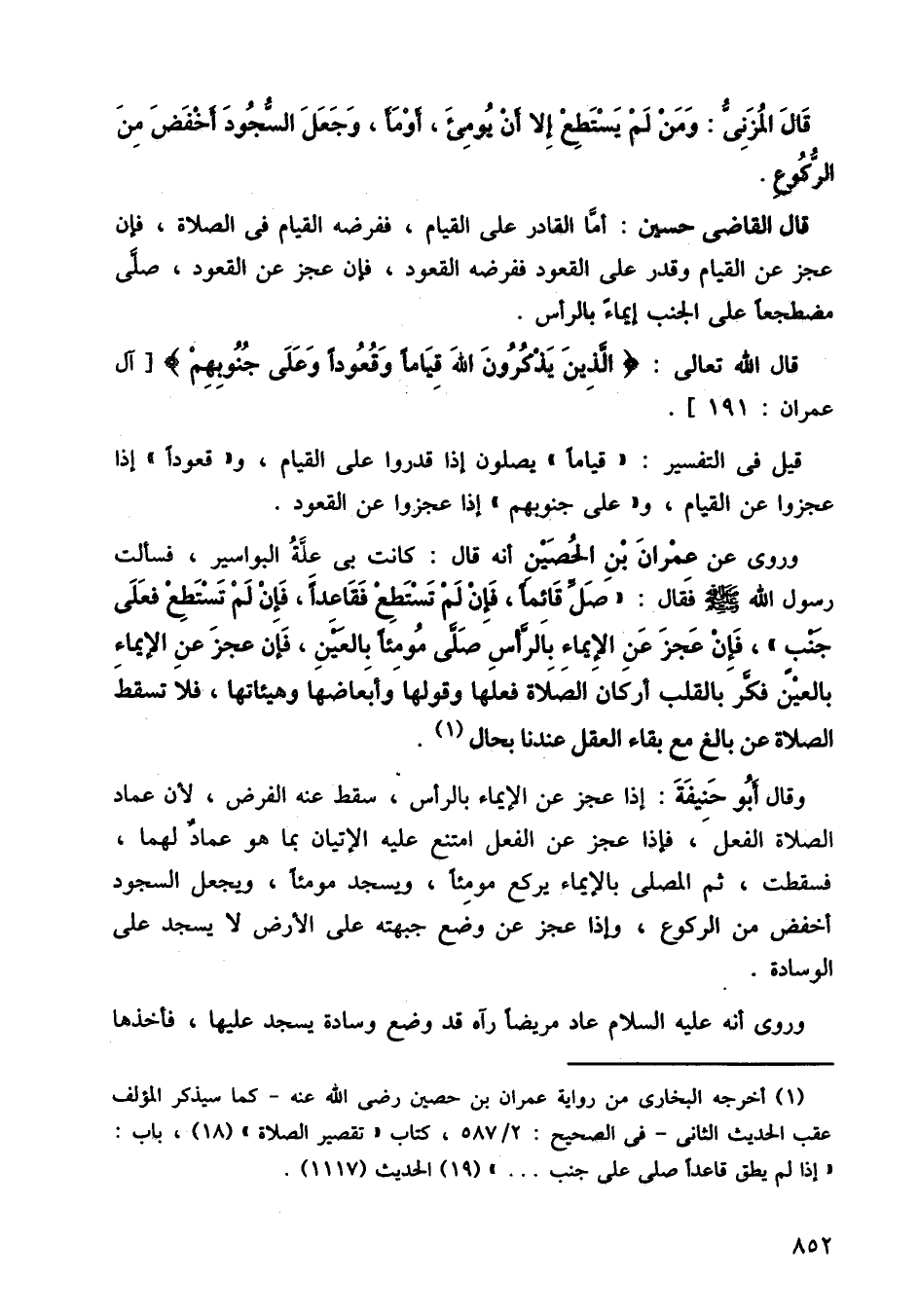 وروى عن عمرن بن الحصين أنه قال: كانت بي علة البواسير، فسألتُ رسول الله صلى الله عليه وسم فقال: صل قائمًا، فإن لم تستطع فقاعدًا، فإن لم تستطع فعلى جنب. فإن عجز عن الإيماء بالرأس صلى مومئًا بالعين، فإن عجز عن الإيماء بالعين فكر بالقلب أركان الصلاة فعلها وقولها وأبعاضها وهيئاتها، فلا تسقط الصلاة عن بالغ مع بقاء العقل عندنا بحال.