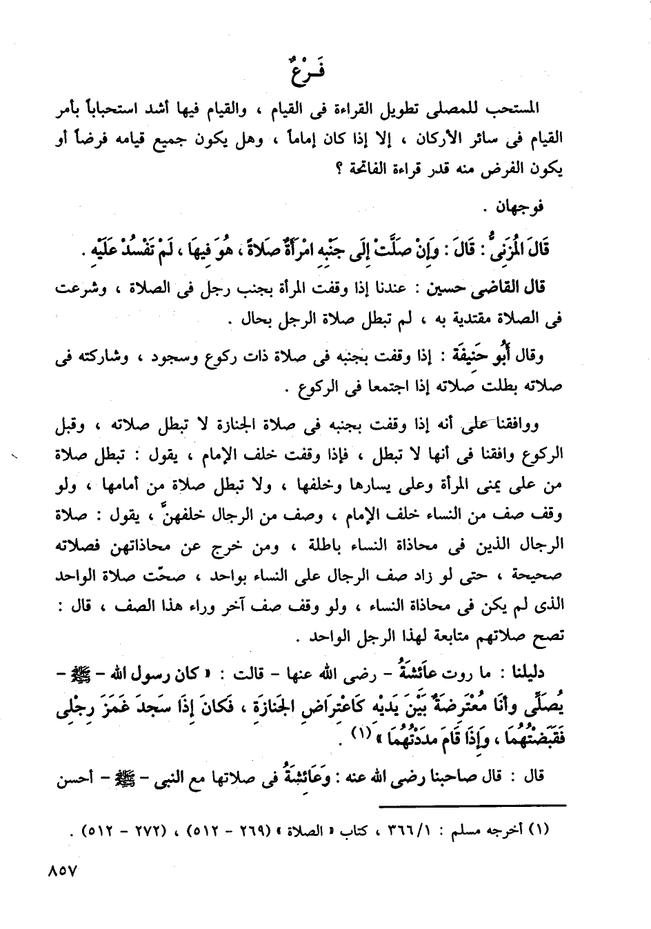 ووافقنا على أنه إذا وقفت بجنبه في صلاة الجنازة لا تبطل صلاته، وقبل الركوع وافقنا في أنها لا تبطل، فإذا وقفت خلف الإمام، يقول: تبطل صلاة من على يمني المرأة وعلى يسارها وخلفها، ولا تبطل صلاة من أمامها، ولو وقف صف من النساء خلف الإمام، وصف من الرجال خلفهن، يقول: صلاة الرجال الذين في محاذاة النساء باطلة، ومن خرج عن محاذاتهن، فصلاته صحيحة، حتى لو زاد صف الرجال على النساء بواحد، صحت صلاة الواحد الذي لم يكن في محاذاة النساء، ولو وقف صف آخر وراء هذا الصف، قال: تصح صلاتهم متابعة لهذا الرجل الواحد.
