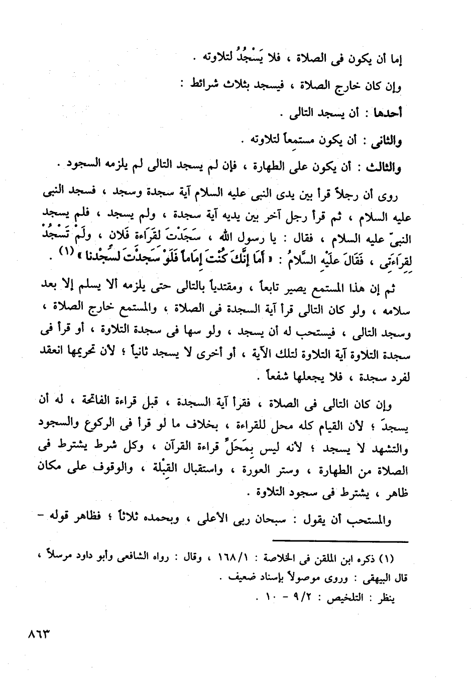 وإن كان التالي في الصلاة، فقرأ آية السجدة، قبل قراءة الفاتحة، له أن يسجد، لأن القيام كله محل للقراءة، بخلاف ما لو قرأ في الركوع والسجود والتشهد لا يسجد، لأنه ليس بمحل قراءة القرآن، وكل شرط يسترط في الصلاة من الطهارة، وستر العورة، واستقبال القبلة، والوقوف على مكان ظاهر، يشترط في سجود التلاوة.