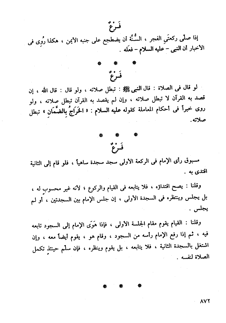 إذا صلى ركعتي الفجر، السنة أن يضطجع على جنبه الأيمن، هكذا روى في الأخبار أن النبي عليه السلام، فعله.