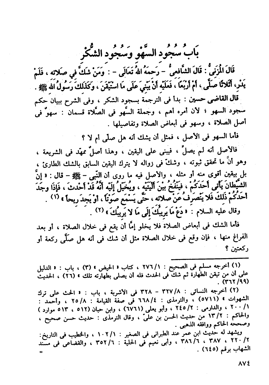 قال المزني: قال الشافعي رحمه الله تعالى -: ومن شك في صلاته، فلم يدر، أثلاثًا صلى، أم أربعًا، فعليه أن يبني على ما استيقن، وكذلك رسول الله صلى الله عليه وسلم، قال القاضي حسين: بدأ في الترجمة بسجود الشكر، وفي الشرح ببيان حكم سجود السهو، لأن أمره أهم، وجملة السهو في الصلاة قسمان، سهو في أصل الصلاة في الأصل، فمثل أن يشك أنه هل صلى أم لا؟