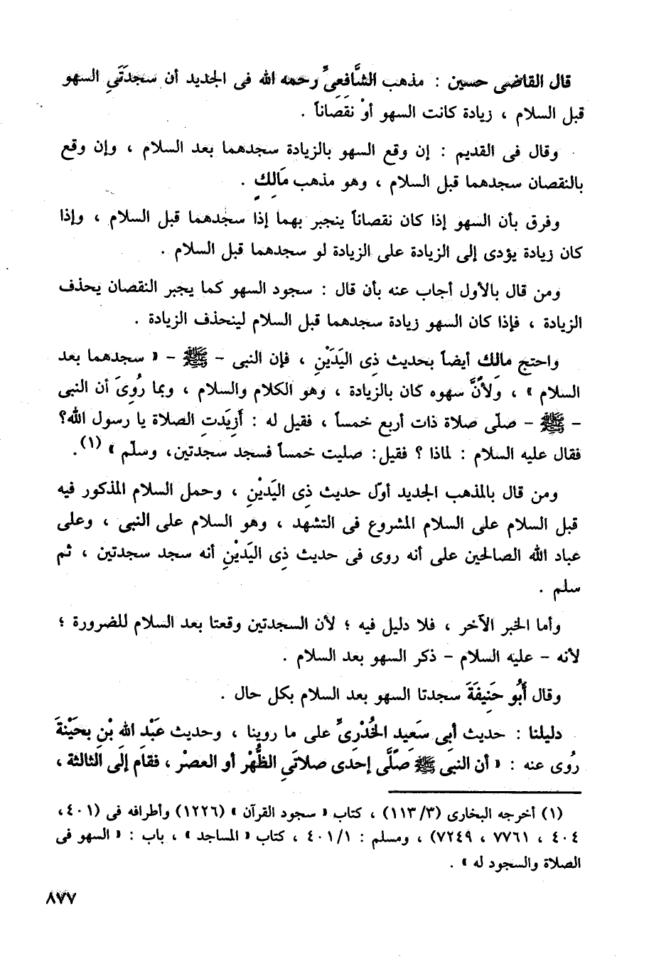 واحتج مالك أيضا بحديث ذي اليدين، فإن النبي صلى الله عليه وسلم سجدهما بعد السلام، ولأن سهوه كان بالزيادة، وهو الكلام والسلام، وبما روى أن النبي صلى الله عليه وسلم صلى صلاة ذات أربع خمسًا، فقيل له: أزيدت الصلاة يا رسول الله؟ فقال عليه السلام: لماذا؟ فقيل: صليت خمسًا فسجد سجدتين، وسلم.