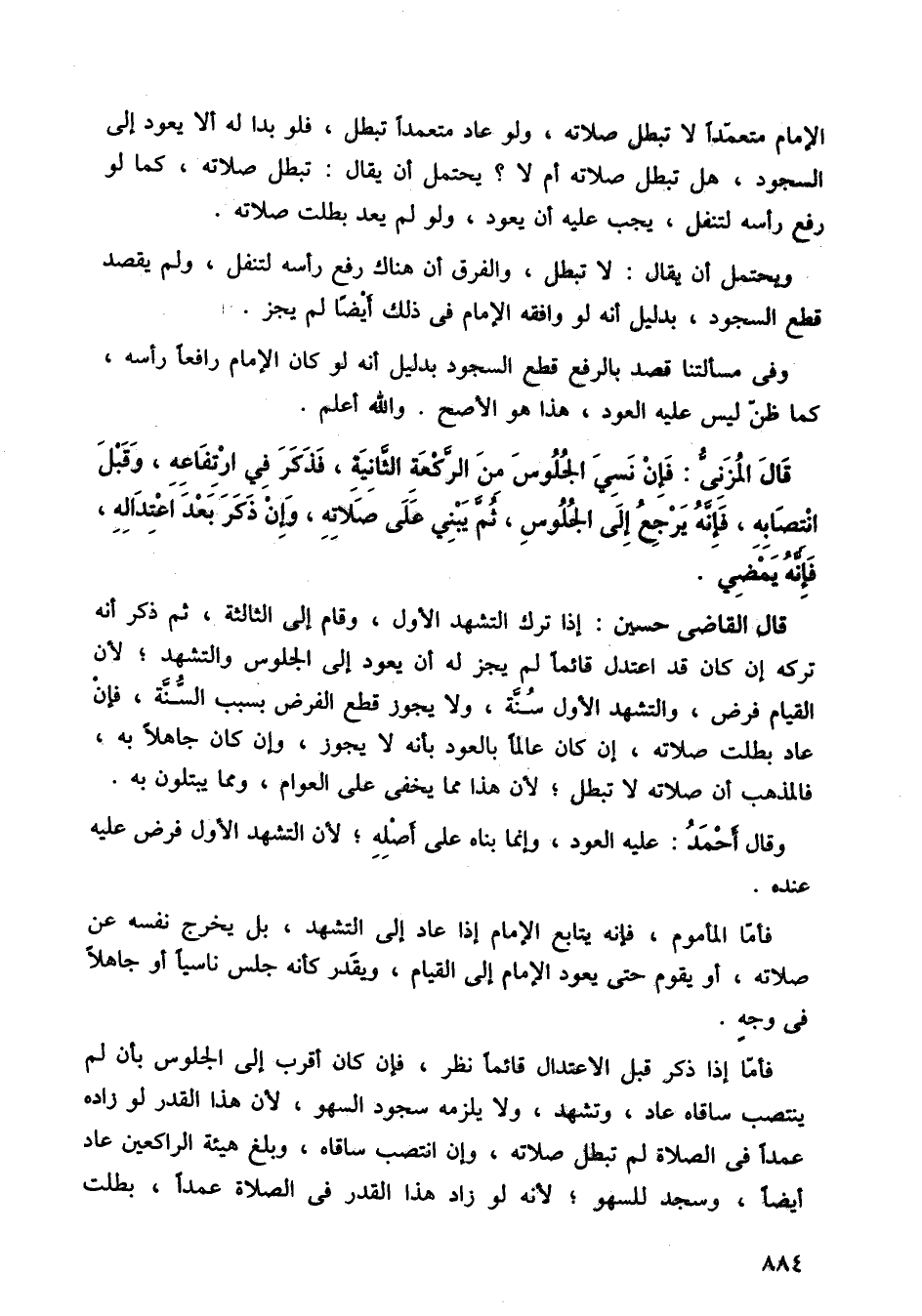 قال القاضي حسين: إذا ترك التشهد الأول، وقام إلى الثالثة، ثم ذكر أنه تركه إن كان قد اعتدل قائمًا لم يجز له أن يعود إلى الجلوس والتشهد، لأن القيام فرض، والتشهد الأول سنة، ولا يجوز قطع الفرض بسبب السنة، فإن عاد بطلت صلاته، إن كان عالمًا بالعود بأنه لا يجوز، وإن كان جاهلاً به، فالمذهب أن صلاته لا تبطل، لأن هذا مما يخفي على العوام، ومما يبتلون به.