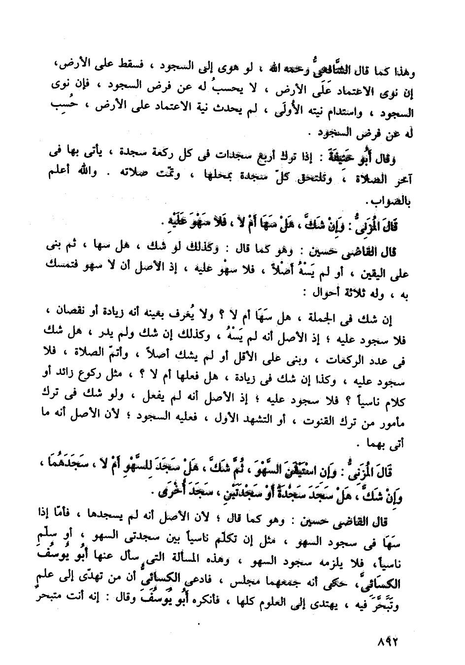 قال القاضي حسين: وهو كما قال؛ لأن الأصل أنه لم يسجدها، فأما إذا سها في سجود السهو، مثل إن تكلم ناسيًا بين سجدتي السهو، أو سلم ناسيًا، فلا يلزمه سجود السهو، وهذه المسألة التي سأل عنها أبو يوسف الكسائي، حكى أنه جمعهما مجلس، فادعى الكسائي أن من تهدي إلى علم وتبحر فيه، يهتدى إلى العلوم كلها، فأنكره ابو يوسف وقال: إنه أنت متبحرٌ