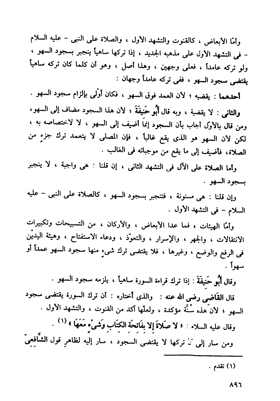 وأما الأبعاض، كالقنوت والتشهد الأول، والصلاة على النبي عليه السلام في التشهد الأول على مذهبه الجديد، إذا تركها ساهيًا ينجبر بسجود السهو، ولو تركه عامدًا، فعلى وجهين، وهذا أصل، وهو أن كلما كان تركه ساهيًا يقتضي سجود السهو، ففي تركه عامدًا وجهان: