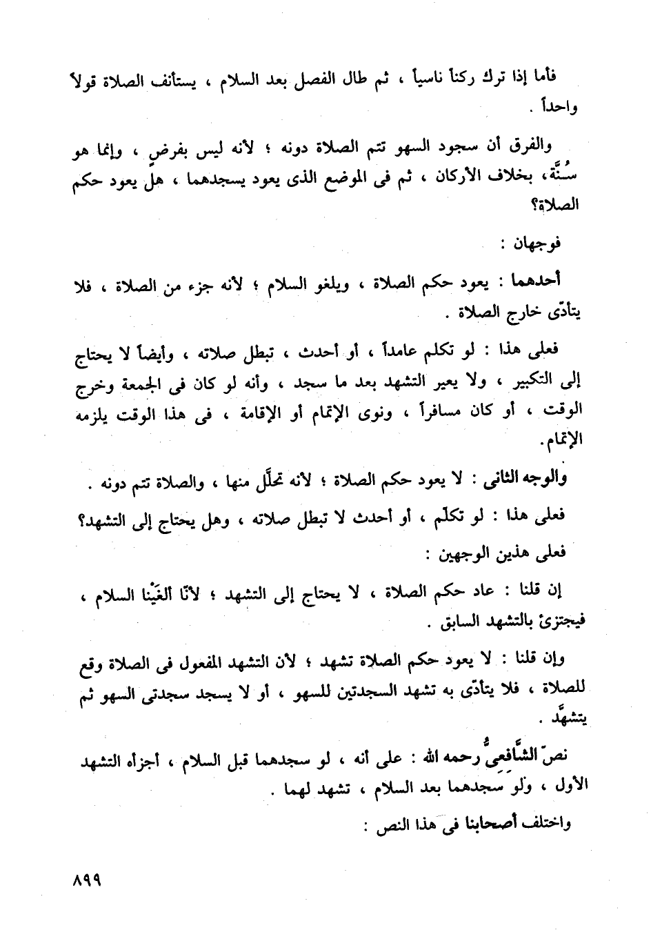 والوجه الثاني: لا يعود حكم الصلاة؛ لأنه تحلل منها، والصلاة تتم دونه. فعلى هذا: لو تكلم أو أحدث لا تبطل صلاته، وهل يحتاج إلى التشهد؟ فعلى هذين الوجهين: