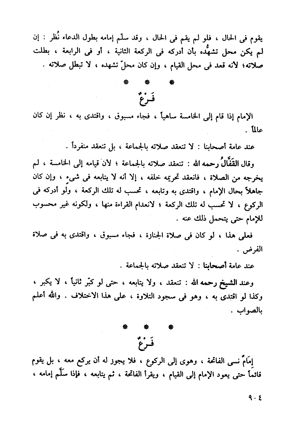 إمام نسي الفاتحة، وهوى إلى الركوع، فلا يجوز له أن يركع معه، بل يقوم قائمًا حتى يعود الإمام إلى القيام، ويقرأ الفاتحة، ثم يتابعه، فإذا سَلَّم إمامه،