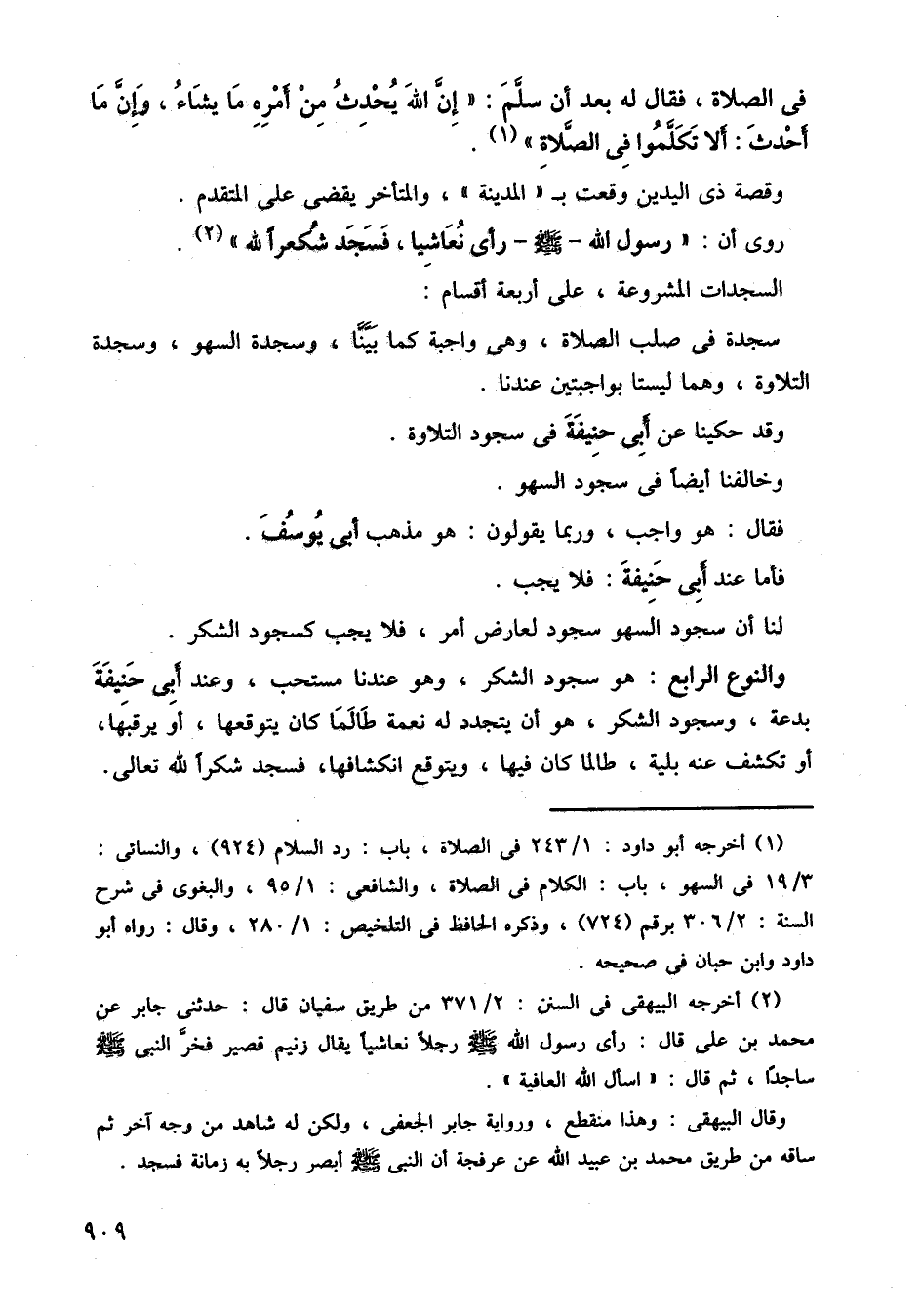 والنوع الرابع: هو سجود الشكر، وهو عندنا مستحب، وعند أبي حنيفة بدعة، وسجود الشكر، هو أن يتجدد له نعمة طالما كان يتوقعها، أو يرقبها أو تكشف عنه بلية، طالما كان فيها، ويتوقع انكشافها، فسجد شكرا لله تعالى.