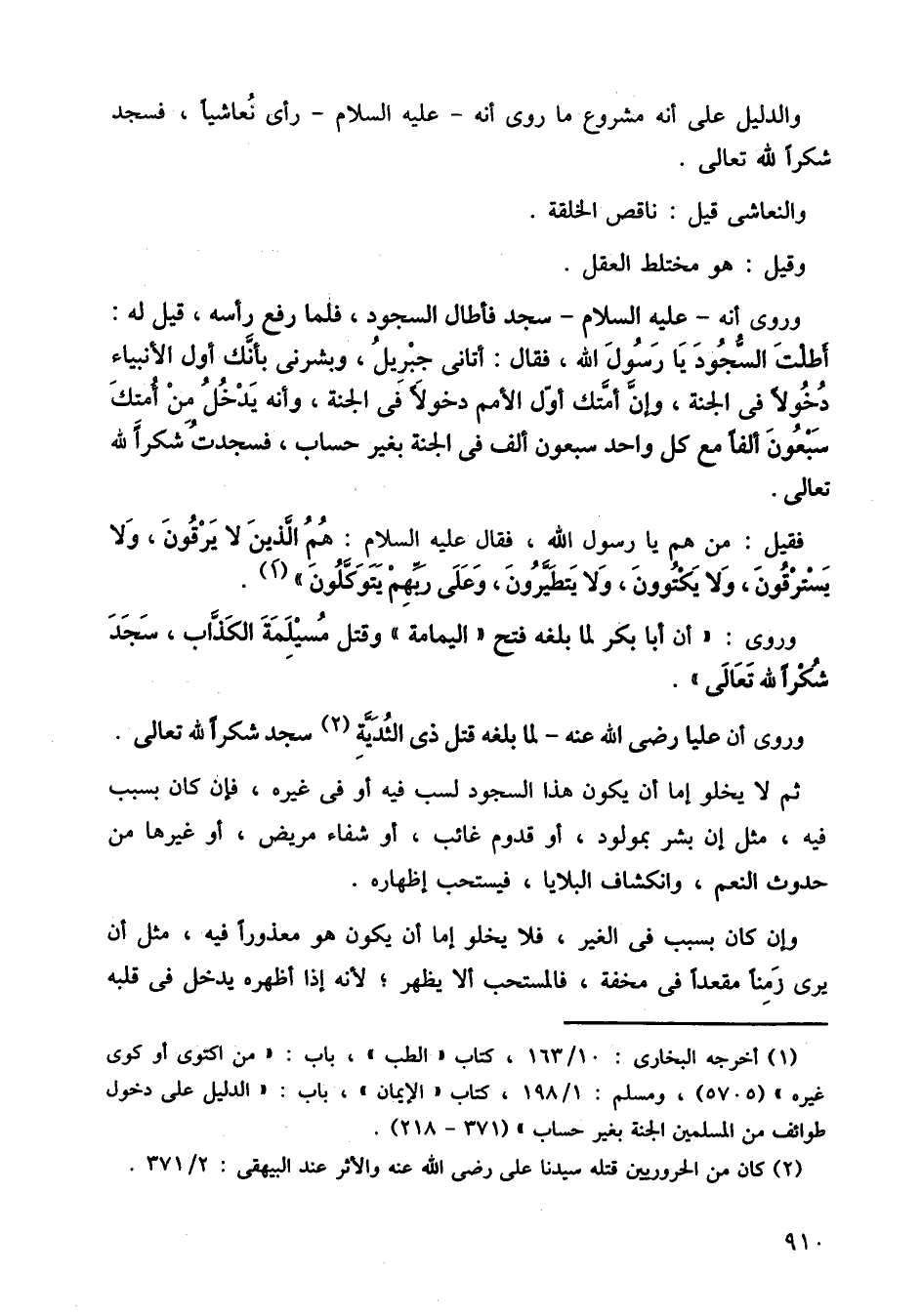 وروى انه عليه السلام سجد فأطال السجود فلما رفع رأسه قيل له: أطلت السجود يا رسول الله فقال أتاني جبريل، وبشرني بأنك أول الأنبياء دخولا في الجنة، وإن أمتك أول الأمم دخولا في الجنة، وأنه يدخل من أمتك سبعون ألفا مع كل واحد سبعون ألف في الجنة بغير حساب فسجدت شكرًا لله تعالى.