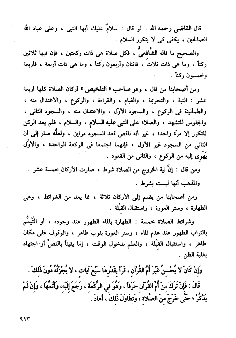 ومن أصحابنا من قال: وهو صاحب التلخيص أركان الصلاة كلها أربعة عشر النية والتحريمة والقيام والقراءة والركوع، والاعتدال منه والطمأنينة في الركوع، والسجود الأول، والاعتدال منه، والسجود الثاني، والجلوس للتشهد، والصلاة على النبي عليه السلام والسلام فلم يعد الركن للتكرر الا مرة واحدة، غير أنه ناقص قعد السجود مرتين، ولعله صار إلى أن الثاني من السجود غير الأول، فإنهما اجتمعا في الركعة الواحدة، والأول يهوي إليه من الركوع، والثاني من القعود.