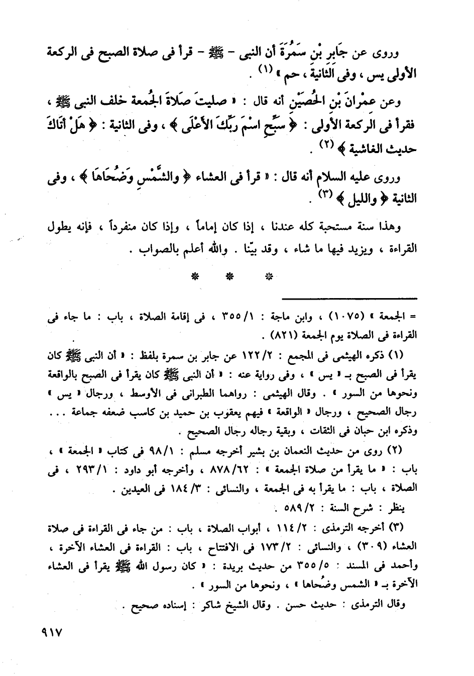 وعن عمران بن الحصين، أنه قال: صليت صلاة الجمعة خلف النبي صلى الله عليه وسلم، فقرأ في الركعة الأولى: سبح اسم ربك الأعلى، وفي الثانية: هل أتاك حديث الغاشية.