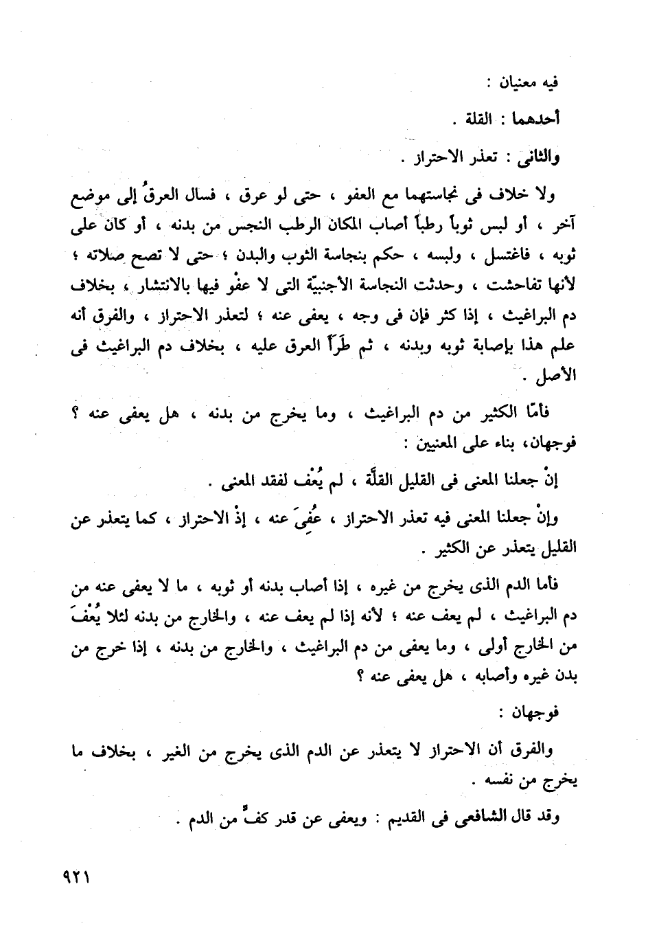 فأما الدم الذي يخرج من غيره، إذا أصاب بدنه أو ثوبه، ما لا يعفي عنه من دم البراغيث، لم يعف عنه، لأنه إذا لم يعف عنه، والخارج من بدنه لئلا يعف من الخارج أولى، وما يعفي من دم البراغيث، والخارج من بدنه، إذا خرج من بدن غيره وأصابه، هل يعفى عنه؟