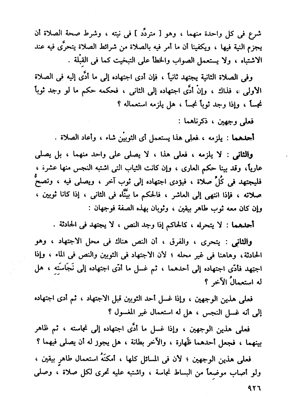 والثاني: لا يلزمه، فعلى هذا، لا يصلي على واحد منهما، بل يصلي عاريًا، وقد بينا حكم العاري، وإن كانت الثياب التي اشتبه النجس منها عشرة، فليجتهد في كل صلاة، فيؤدي اجتهاده إلى ثوب آخر، ويصلي فيه، وتصح صلاته، فإذا انتهي إلى العاشر، فالحكم ما بيناه في الثاي، إذا كانا ثوبين وإن كان معه ثوب طاهر بيقين، وثوبان بهذه الصفة فوجهان: