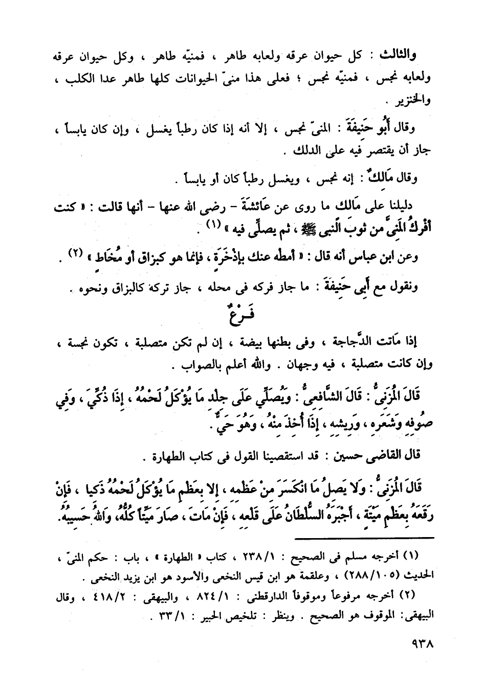 والثالث: كل حيوان عرقه ولعابه طاهر، فمنيه طاهر، وكل حيوان عرقه ولعابه نجس، فمنيه نجس، فعل هذا مني الحيوانات كلها طاهر عدا الكلب، والخنزير، وقال أبو حنيفة، المني نجس، إلا أنه كان رطبًا يغسل، وإن كان يايسًا جاز أن يقتصر فيه على الدلك.